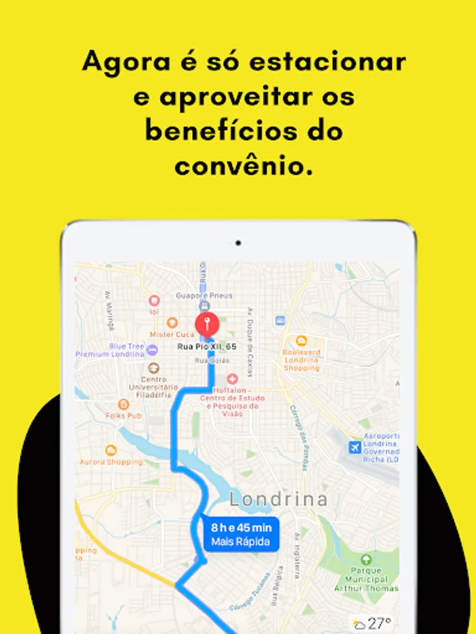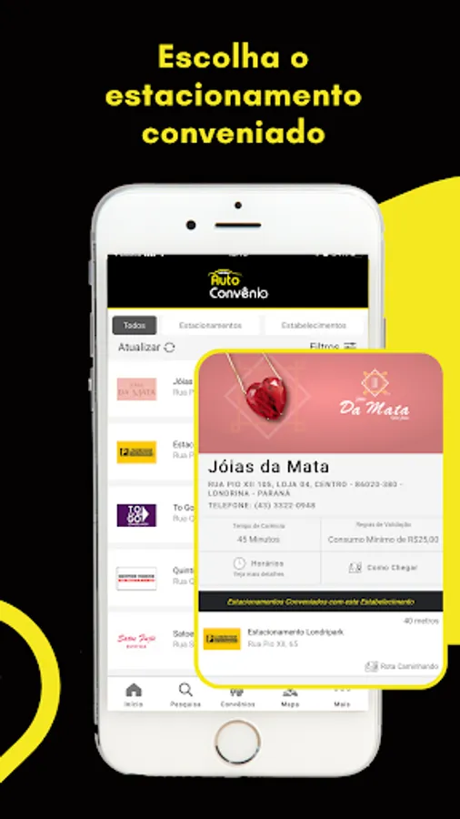 Find more details about your destination. Through the app you can consult additional information about the parking lot or establishment, such as location, opening hours, values, grace period, routes and other information that will help in the best choice for you and your vehicle.
