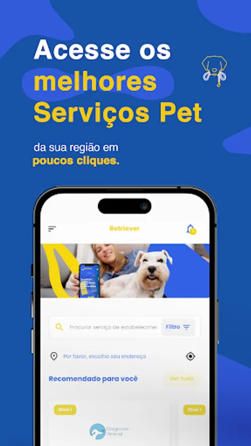 With the Retriever application, the tutor has access to the best services for his pet, including bathing and grooming, daily daycare and accommodation, consultations, vaccines and veterinary exams, walks with a dogwalker, training, among others.