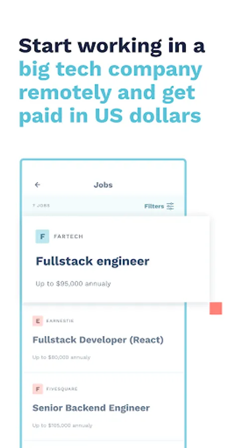 It’s quick and easy: first, import your experiences directly from LinkedIn and make sure your profile is complete. Second, if your profile meets the requirements of our available jobs, one of our tech recruiters will get in touch with you and start the interview process so you can find an amazing remote job earning US dollars regardless of where you are.