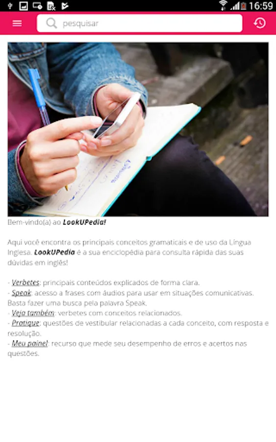 LookUPedia is the encyclopedia for quick reference of your questions in English! In this app you will find the main grammatical concepts and use of the English language, as well as vestibular issues to train their knowledge of the language. With it, you study and checks its direct learning the phone or tablet, without wasting time on internet searches.