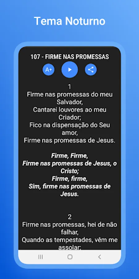 With Night Mode, you will have a more comfortable reading experience. In addition, you can bookmark your favorite hymns ❤️, change the text size for better viewing 🧐 and search for hymns by number or title.