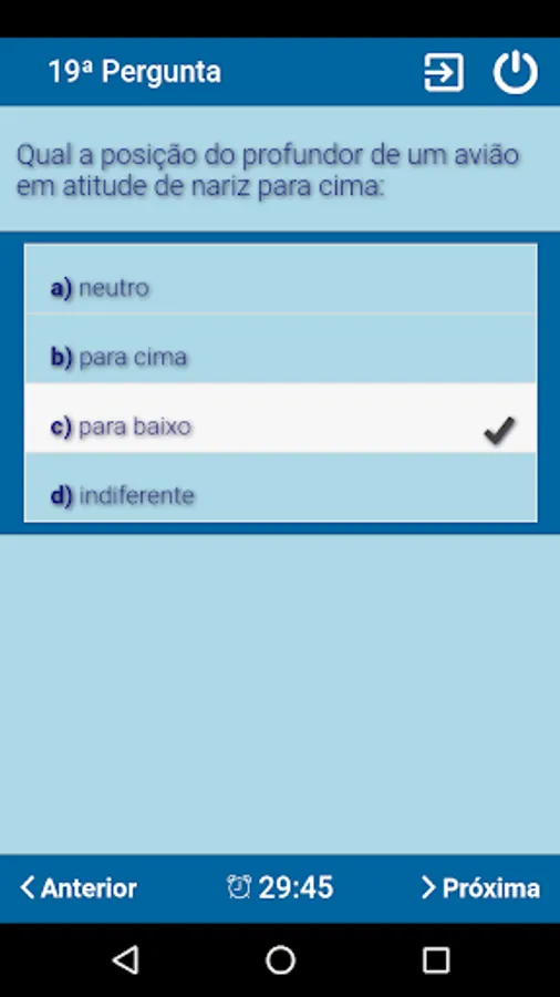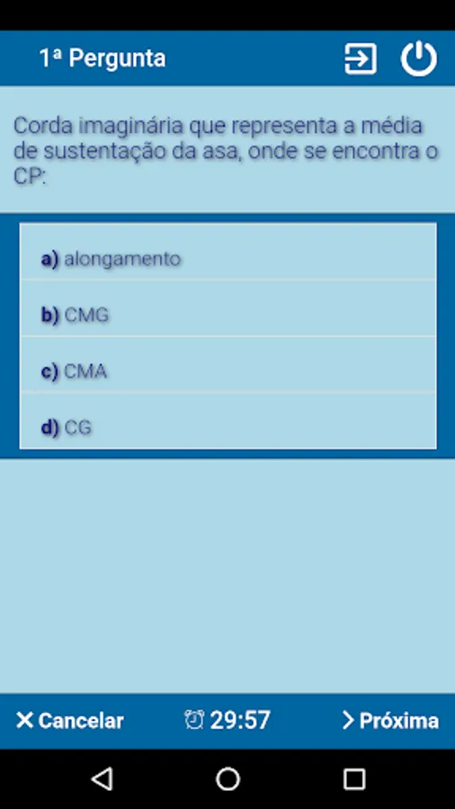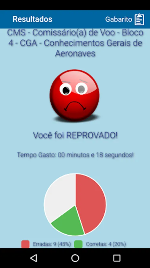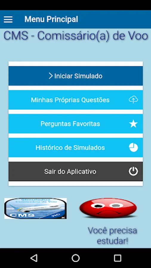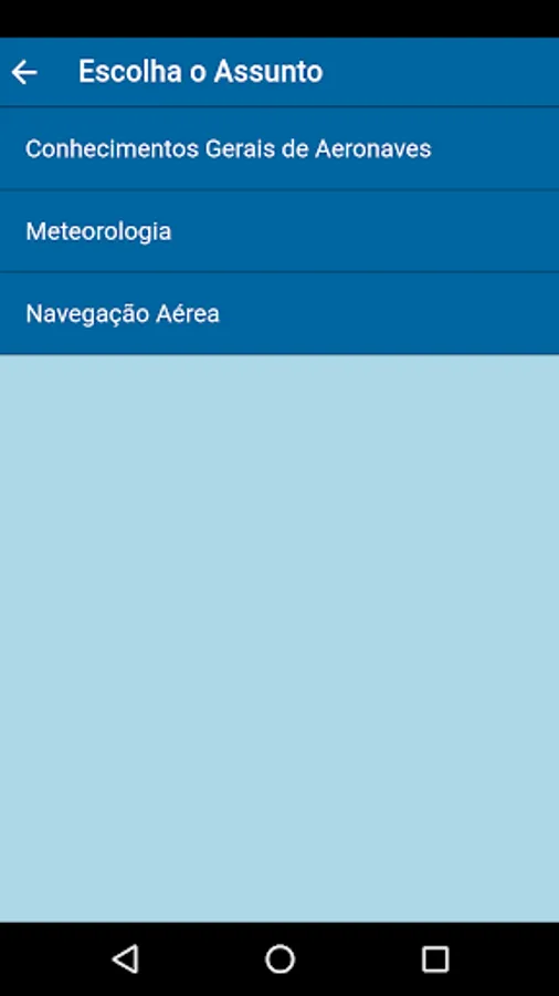 Once downloaded and installed, the APP contains the entire database of questions of the desired course, where the candidate must follow the same rules of the National Civil Aviation Agency Board for approval, containing 20 randomly drawn questions to each simulated and the candidate must hit at least 14 to pass.