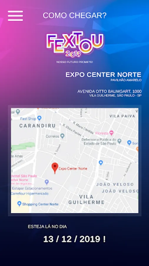 This app brings a touch of modernity and agility to the event, as it has all the information about it time, place of the event, make photo, among others, facilitating the participant's life and providing a great after-event residual effect.