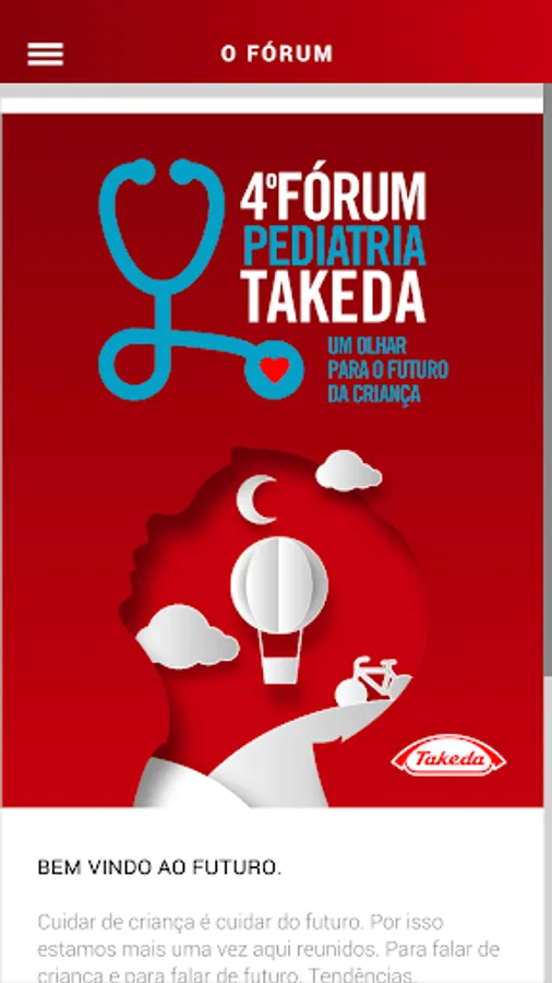 Takeda will hold its 4th Pediatric Forum, bringing together doctors and specialists from across the country. This application brings a touch of modernity and agility to the event, since it has all the information about it: registration, agenda, speakers and their profiles, product dissemination - among others, facilitating the life of the doctor and providing a great residual effect post-event.
