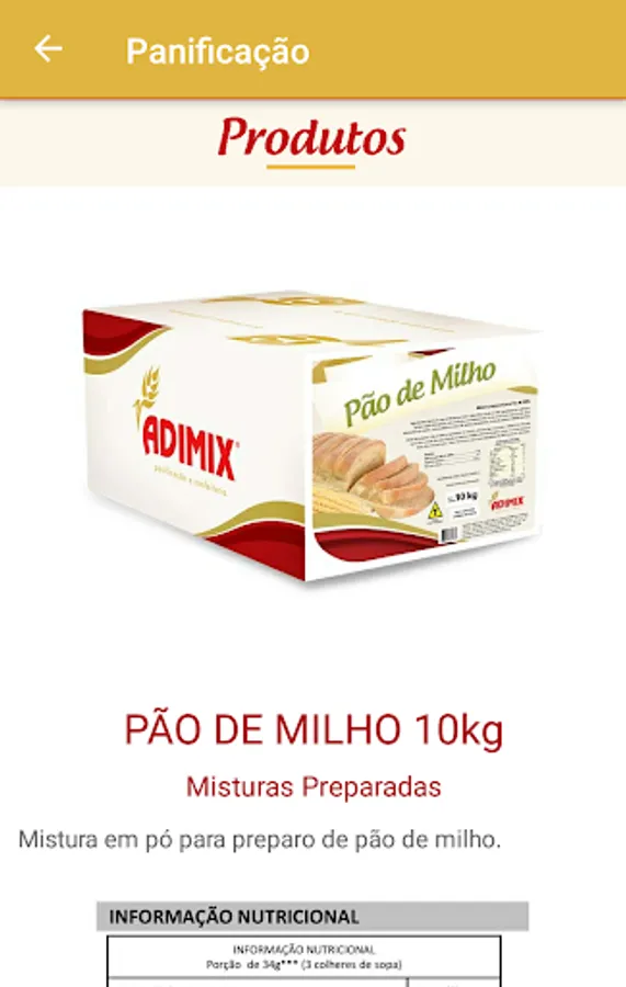 With intuitive navigation, the application presents the list of Adimix products with nutritional information, packaging images, bar codes, PDF files, etc.