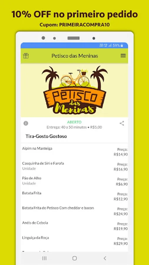 Download our application and place your order in a practical and fast way. Get 10% discount on your first purchase using the coupon PRIMEIRACOMPRA10 in the cart.