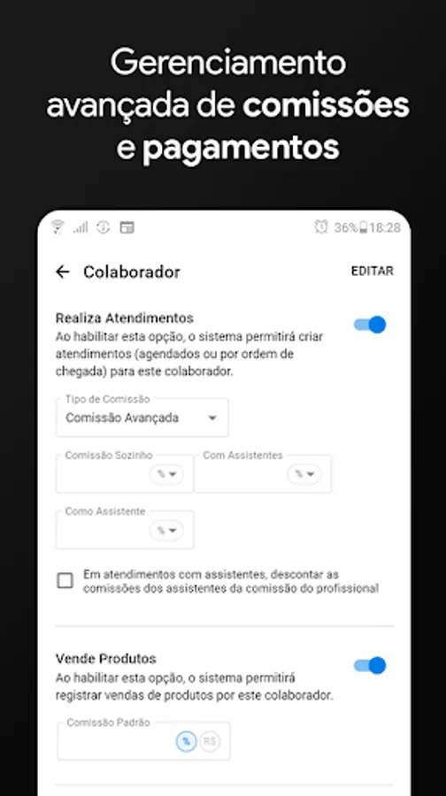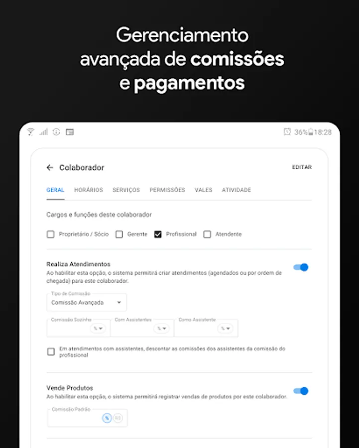 - Commissions: Flexible system for generating commissions, with payment registration and automatic withdrawal of vouchers.