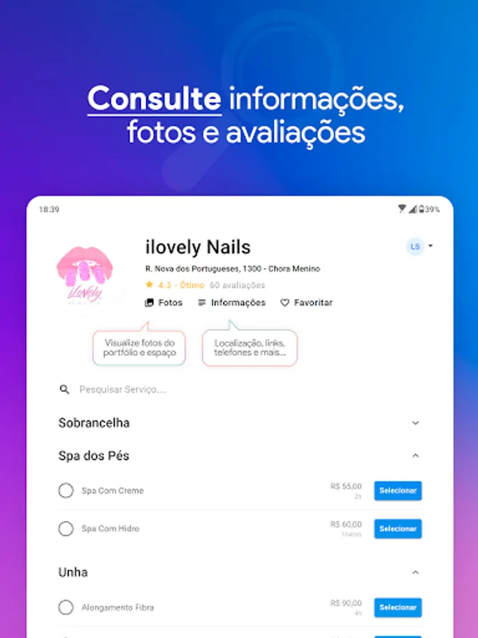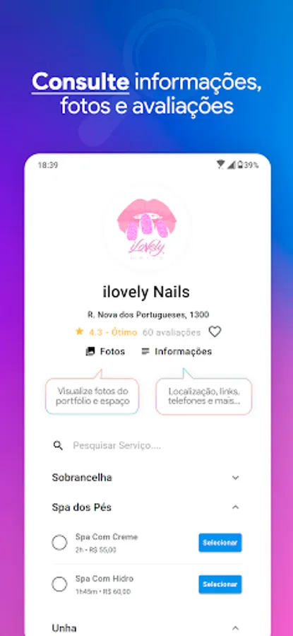 With Salão99 you can schedule beauty and health services online with your favorite professionals. Check out the main features: