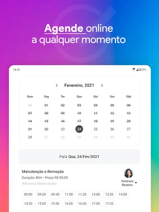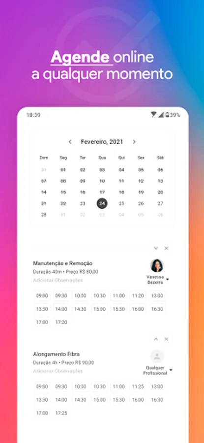 - Schedule services at any time! Consult online the availability of schedules of professionals and make the appointment directly through the application.