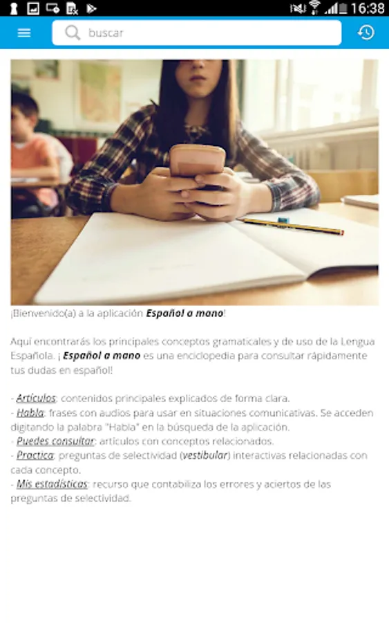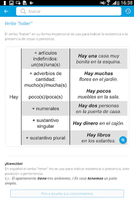 Español a mano is the encyclopedia for quick reference of your questions in Spanish! In this app you will find the main grammatical concepts and use of the Spanish language, and the vestibular issues to train their knowledge of the language. With it, you study and checks its direct learning the phone or tablet, without wasting time on internet searches.