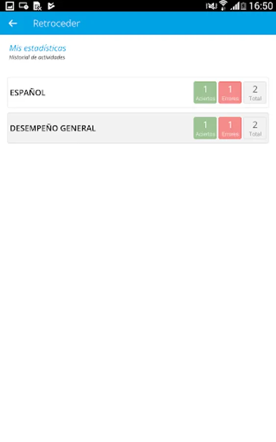 - "Mis Estadísticas": feature that measures their performance, based on trial and error on the issues;