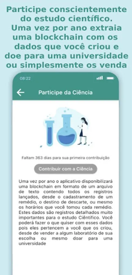12- A scientific tool that collects and keeps the data that you generated safe and encrypted with you on your device and that will enable you in the future to sell or donate a blockchain with all your history of your interaction with your medicines.