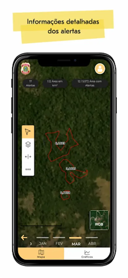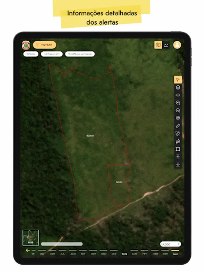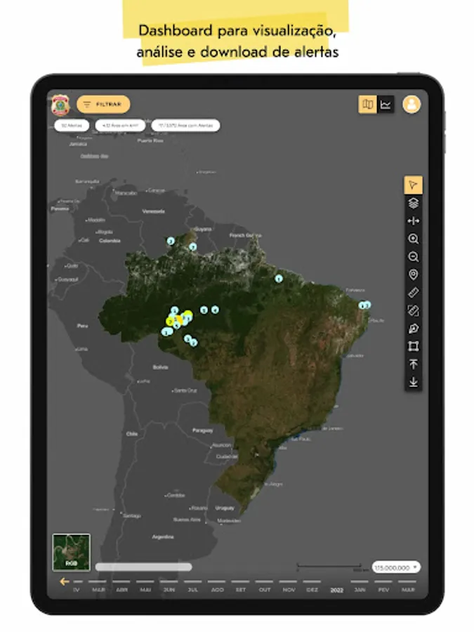 After performing the authentication, the user will have access to the change detection alerts generated for the areas defined by the Federal Police. It is still possible to verify the quantification of alerts, filter by area and period of interest, in addition to observing the polygons on the map and their intersection with other layers, such as the CAR (Rural Environmental Registry), Conservation Units and Indigenous Lands.