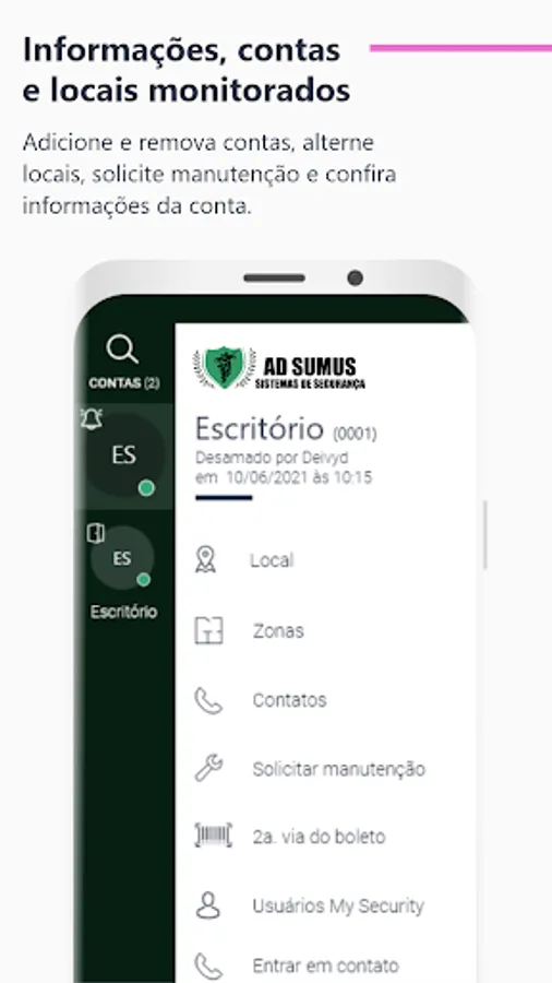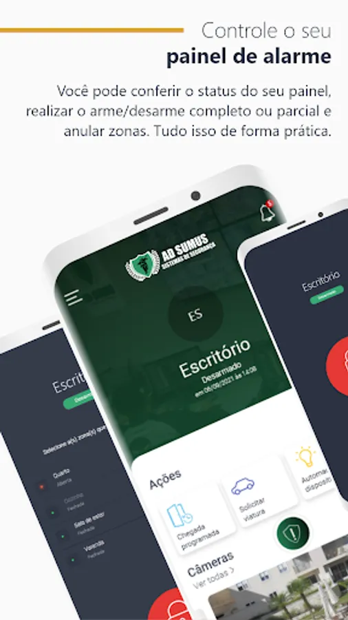 AD SUMUS 24H is a mobile application where the monitored customer can directly monitor all the activities of their security system via cell phone or tablet. Through the application, it is possible to know the status of the alarm panel, arm and disarm it, view live cameras, check events and open work orders, in addition to making phone calls to contacts registered in your profile. It's the security you need in the palm of your hand.