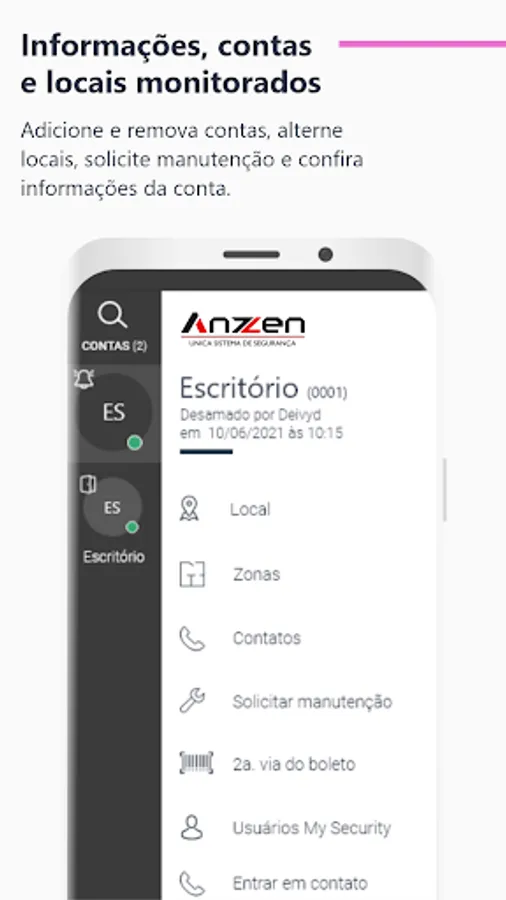 My Anzen is a mobile application where the monitored customer can directly monitor all the activities of their security system via cell phone or tablet. Through the application, it is possible to know the status of the alarm panel, arm and disarm it, view live cameras, check events and open work orders, in addition to making phone calls to contacts registered in your profile. It's the security you need in the palm of your hand.