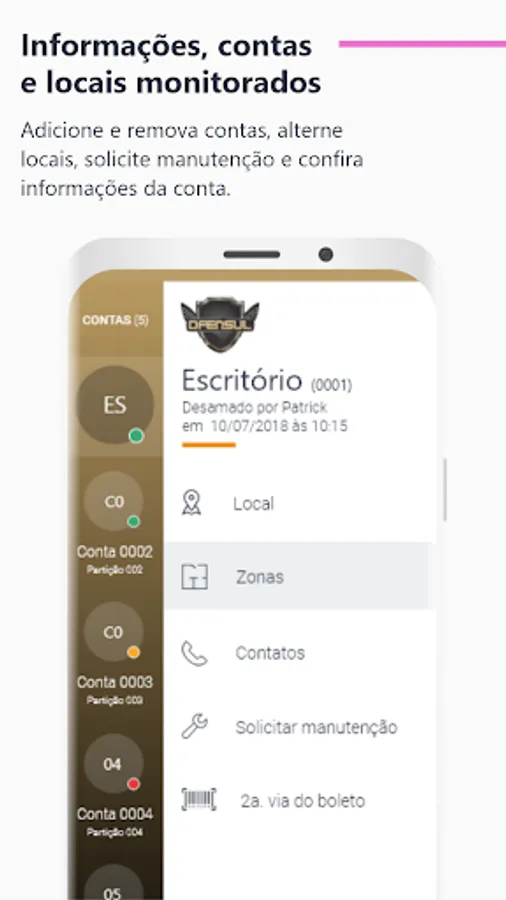 Dfensul Mobile is a mobile application where the monitored customer can directly monitor all activities of his security system via cell phone or tablet. Through the application, it is possible to know the status of the alarm panel, arm it and disarm it, view live cameras, check events and open work orders, in addition to making phone calls to contacts registered in your profile. It's the security you need in the palm of your hand.
