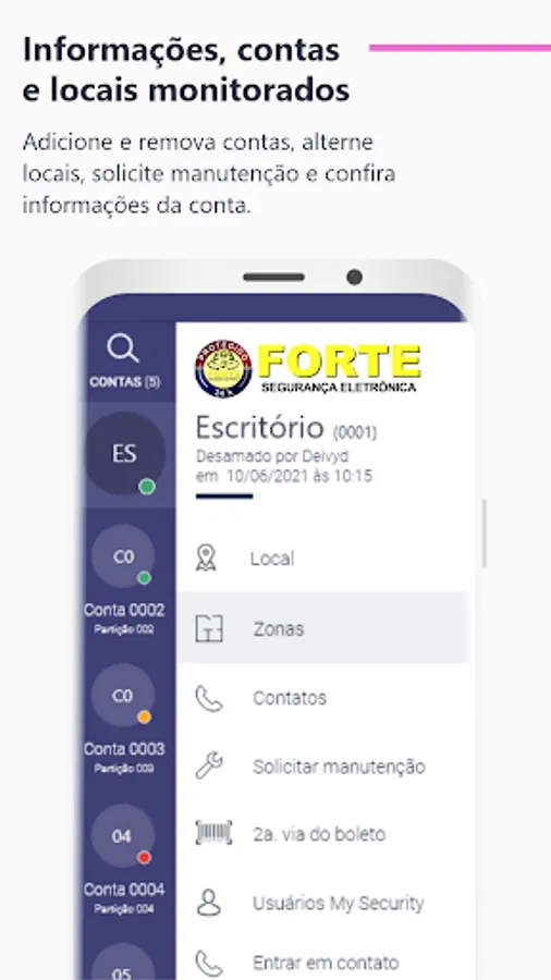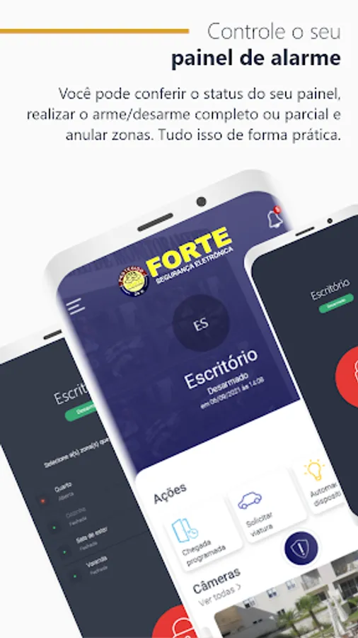 Forte24h is a mobile application where the monitored customer can directly follow all the activities of their security system via cell phone or tablet. Through the application, it is possible to know the status of the alarm panel, arm and disarm it, view live cameras, check events and open work orders, in addition to making phone calls to contacts registered in your profile. It's the security you need in the palm of your hand.