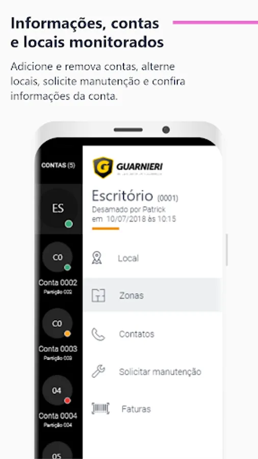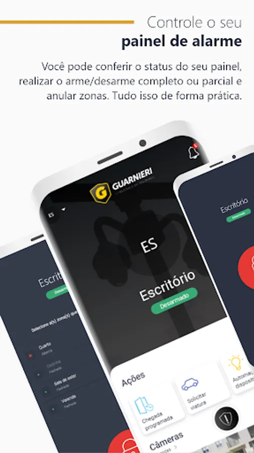 Guarnieri Segurança is a mobile application where the monitored customer can directly follow all the activities of his security system via cell phone or tablet. Through the application it is possible to know the status of the alarm panel, arm it and disarm it, view the live cameras, check events and open work orders and make phone calls to contacts registered in your profile. It's the security you need in the palm of your hand.
