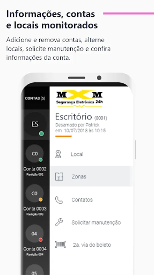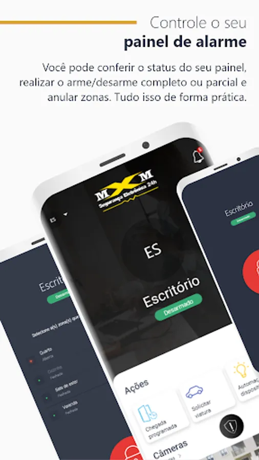 MXM Sei is a mobile application where the monitored customer can directly monitor all activities of his security system via cell phone or tablet. Through the application, it is possible to know the status of the alarm panel, arm it and disarm it, view live cameras, check events and open work orders, Issuance of Boleto Bancário in addition to making telephone calls to contacts registered in the your profile. It's the security and practicality you need in the palm of your hand.