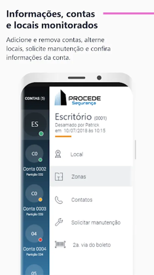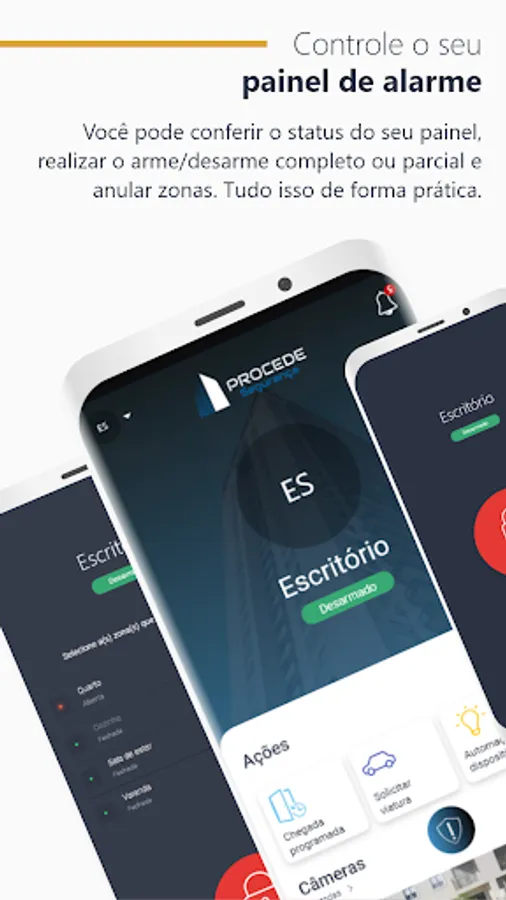 Procede Mobile is a mobile application where the monitored customer can directly monitor all activities of his security system via cell phone or tablet. Through the application, it is possible to know the status of the alarm panel, arm it and disarm it, view live cameras, check events and open work orders, in addition to making phone calls to contacts registered in your profile. It's the security you need in the palm of your hand.