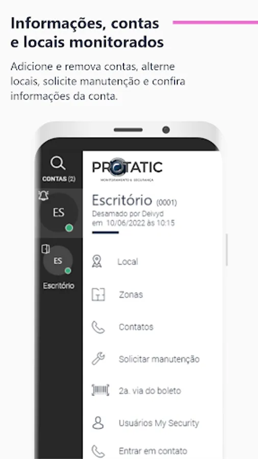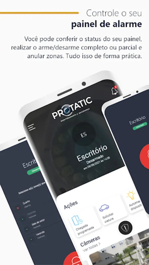 Protatic Security is a mobile application where the monitored customer can directly monitor all activities of their security system via cell phone or tablet. Through the application, it is possible to know the status of the alarm panel, arm and disarm it, view the cameras live, check events and open work orders, in addition to making phone calls to contacts registered in your profile. It's the security you need in the palm of your hand.