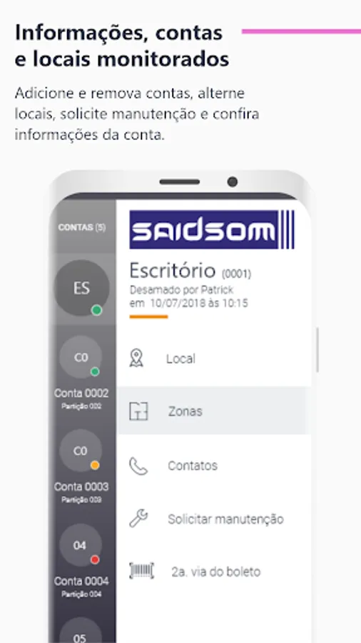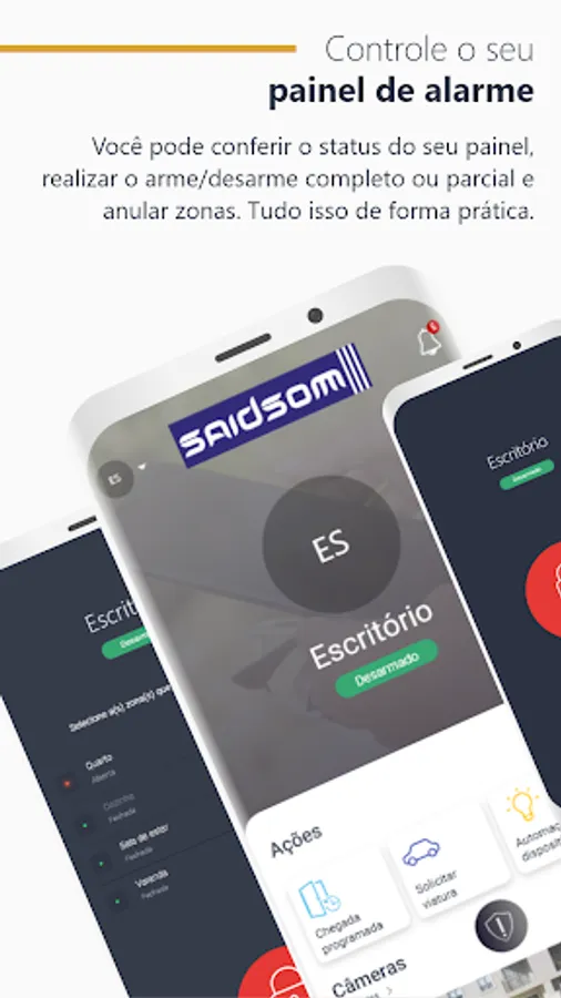 My Saidsom is a mobile application where the monitored customer can directly monitor all activities of his security system via cell phone or tablet. Through the application, it is possible to know the status of the alarm panel, arm it and disarm it, view live cameras, check events and open work orders, in addition to making phone calls to contacts registered in your profile. It's the security you need in the palm of your hand.