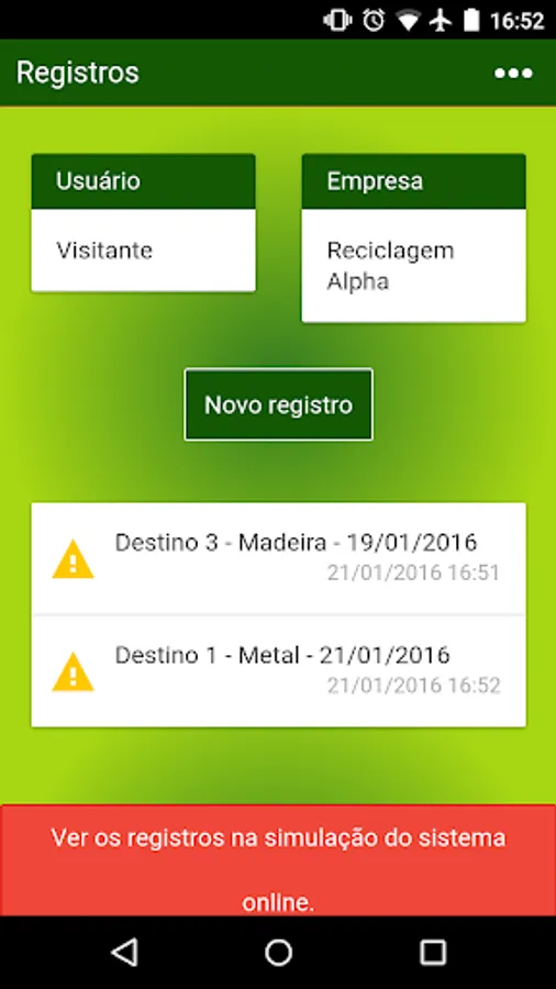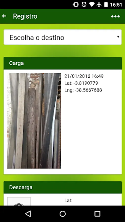 Application that records the time of disposal of waste through photos with automatic capture: position (latitude / longitude), date, time, user and connects to a predefined output, with automatic sending of photos to Selletiva system. This application is part of a fully integrated web solution (www.selletiva.com.br) which manages through: Schedules, Routes, Events, Quality Collection Service, reports, MTRs, Graphics, and Final Disposal etc., drives information (input and output) of waste, including: Descartador <> Collecting Company <> Final Destination.