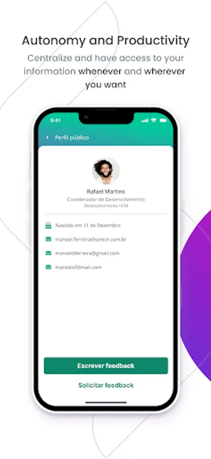 Feedback: send and request feedback to coworkers and share the message on social networks.