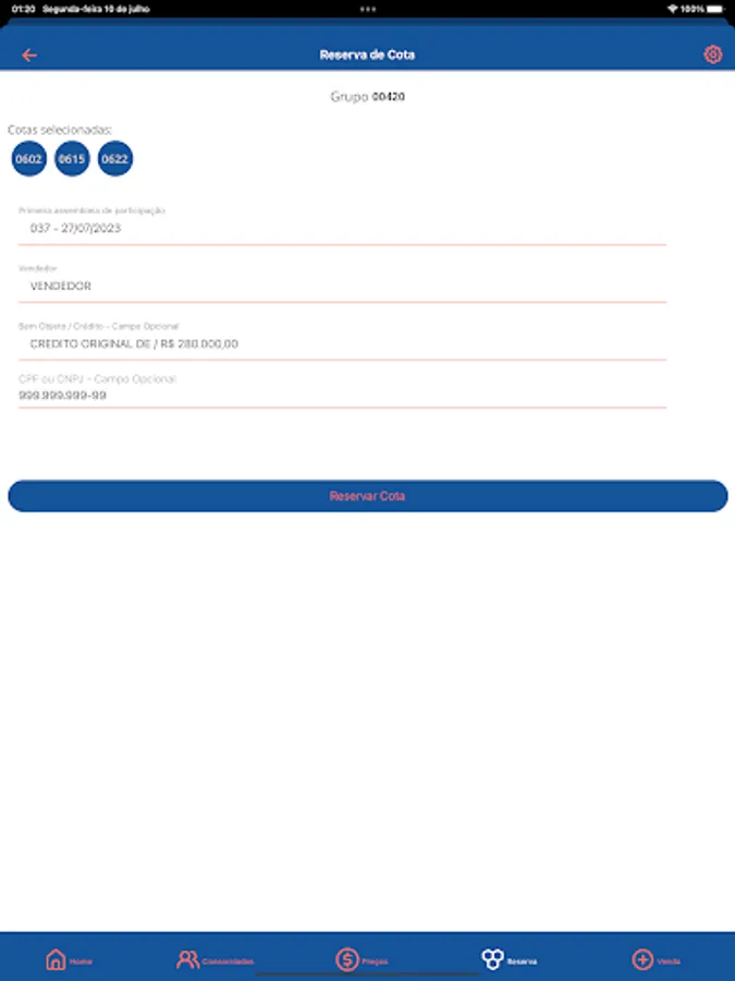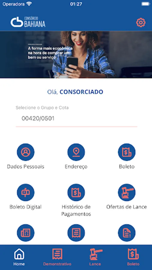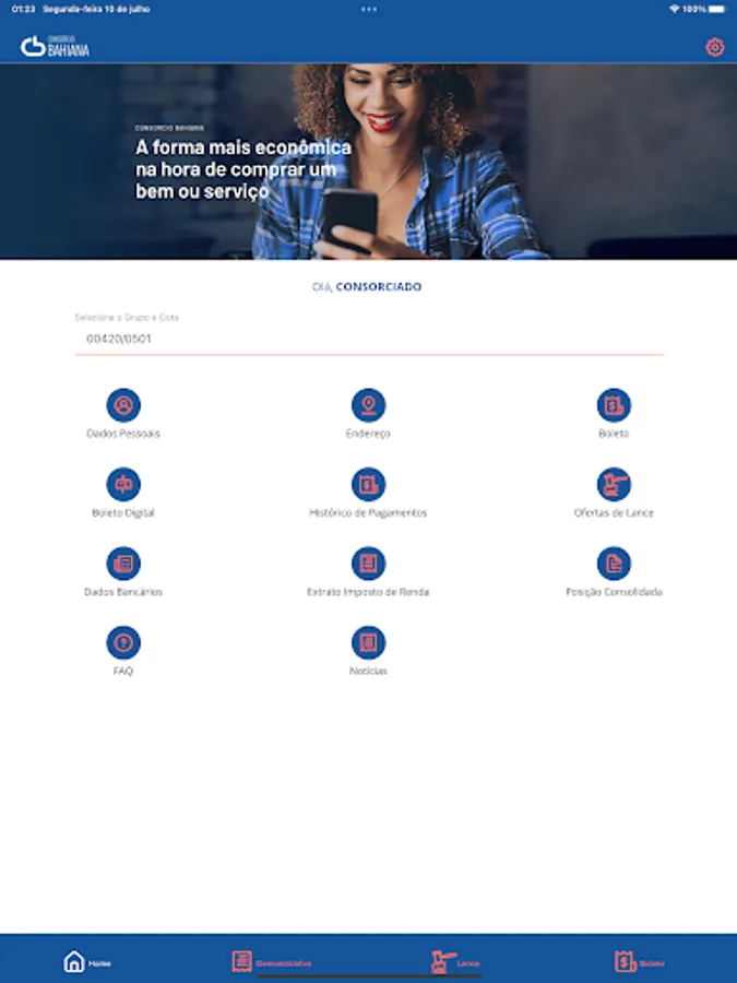 The management of your Consortium Bahiana quota will be in the palm of your hand. Use the app to consult the statement of your consortium, bid, issue slips, consult the result of the meeting and much more! With the Consórcio Bahiana app, you will have all the features to manage the consortium group quickly and safely.