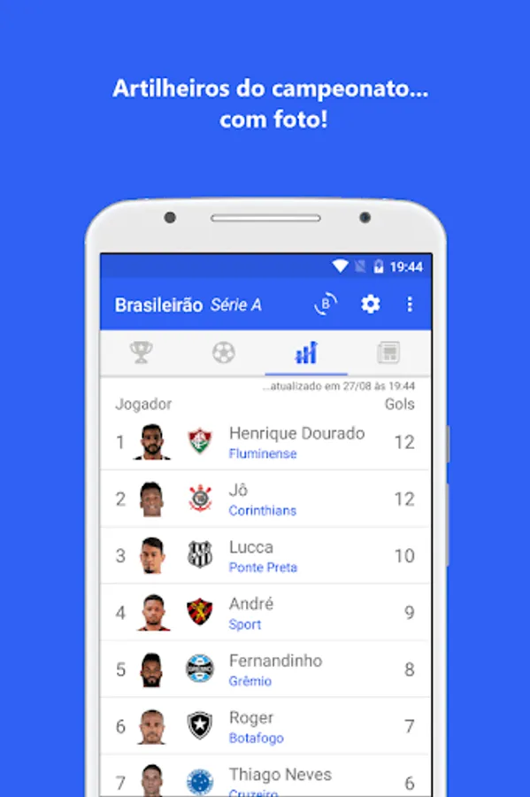 In addition to staying on top of everything that happens in the 2023 Brasileirão Leaderboard, you can also follow the top scorers of the 2023 Brazilian championship during the rounds, with a photo and number of goals in the round.