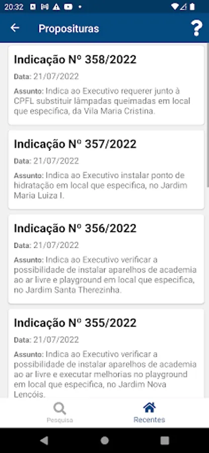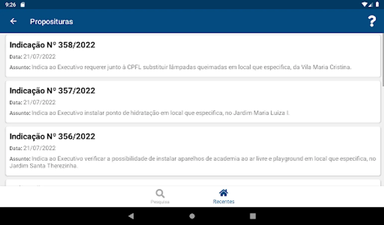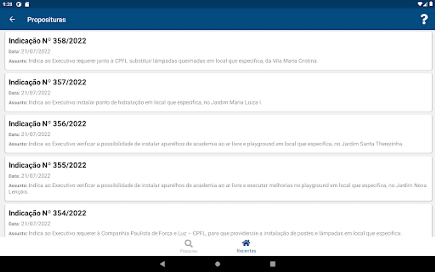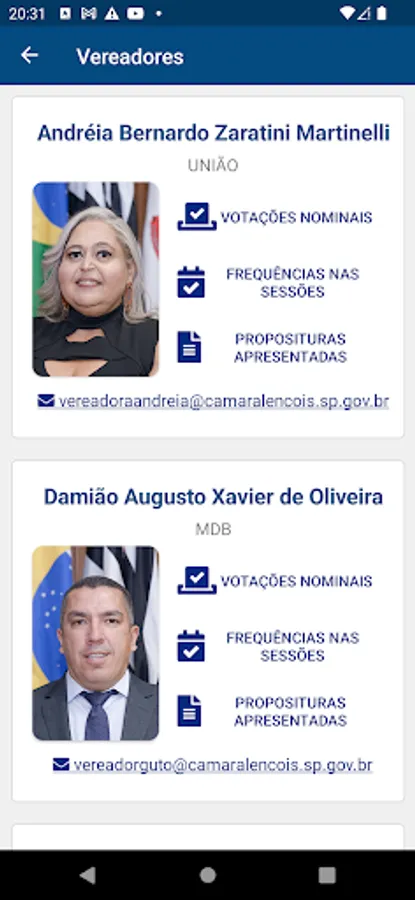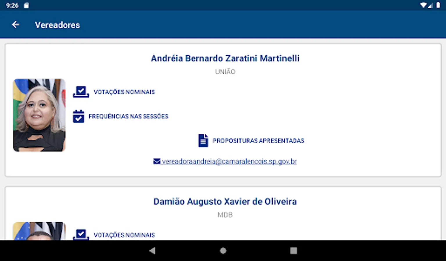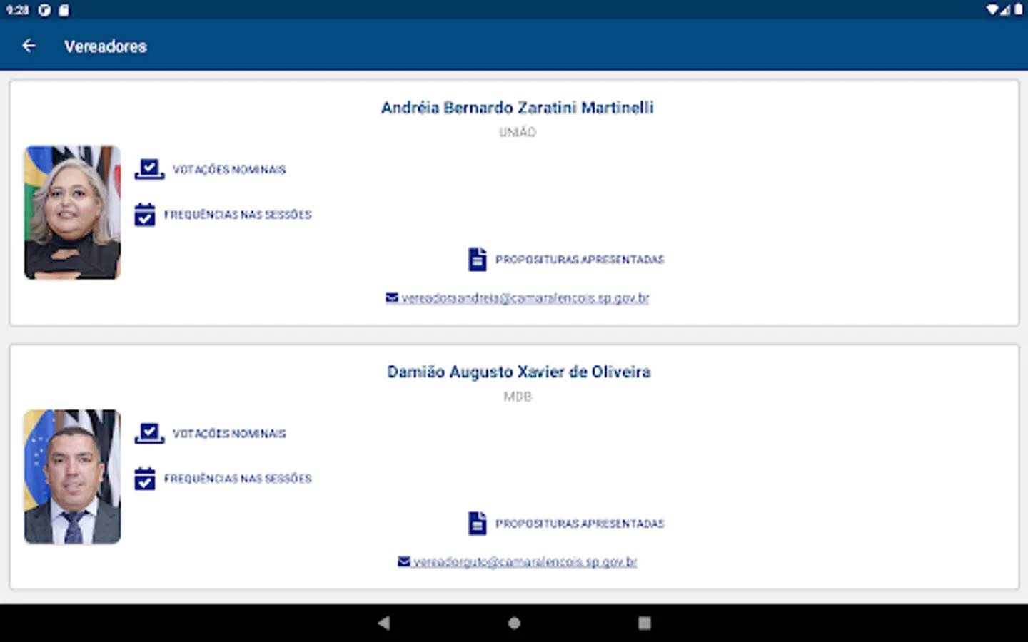 • Consults the list of Councilors in office, showing the name, party, e-mail, telephone, links to proposals presented, attendance at sessions and nominal votes;