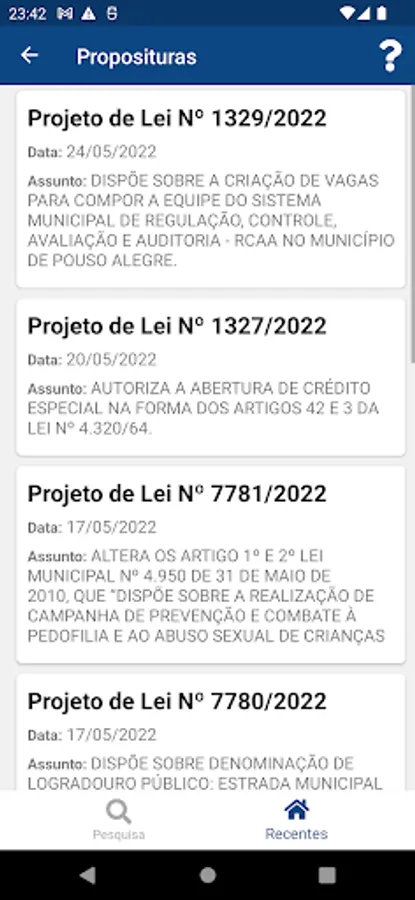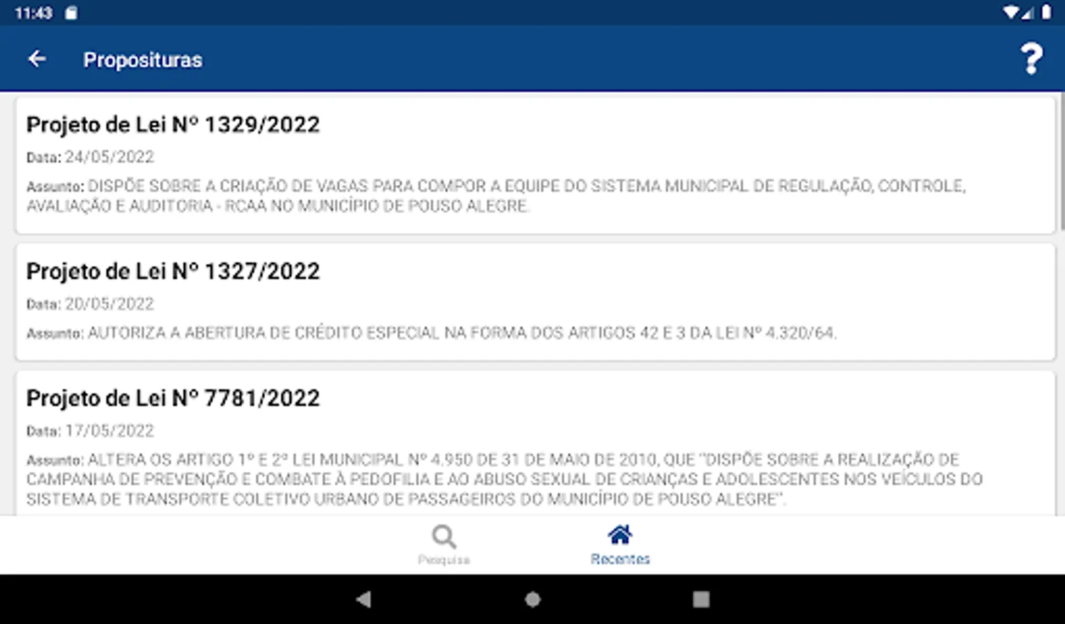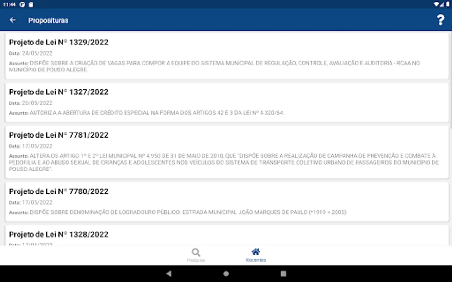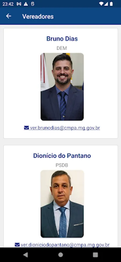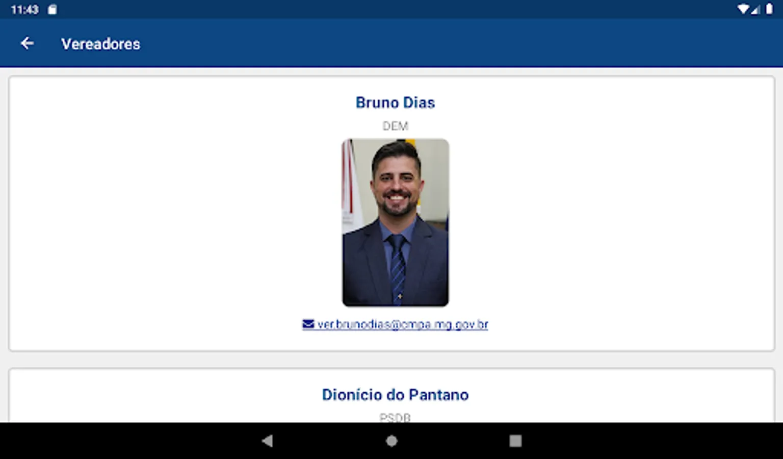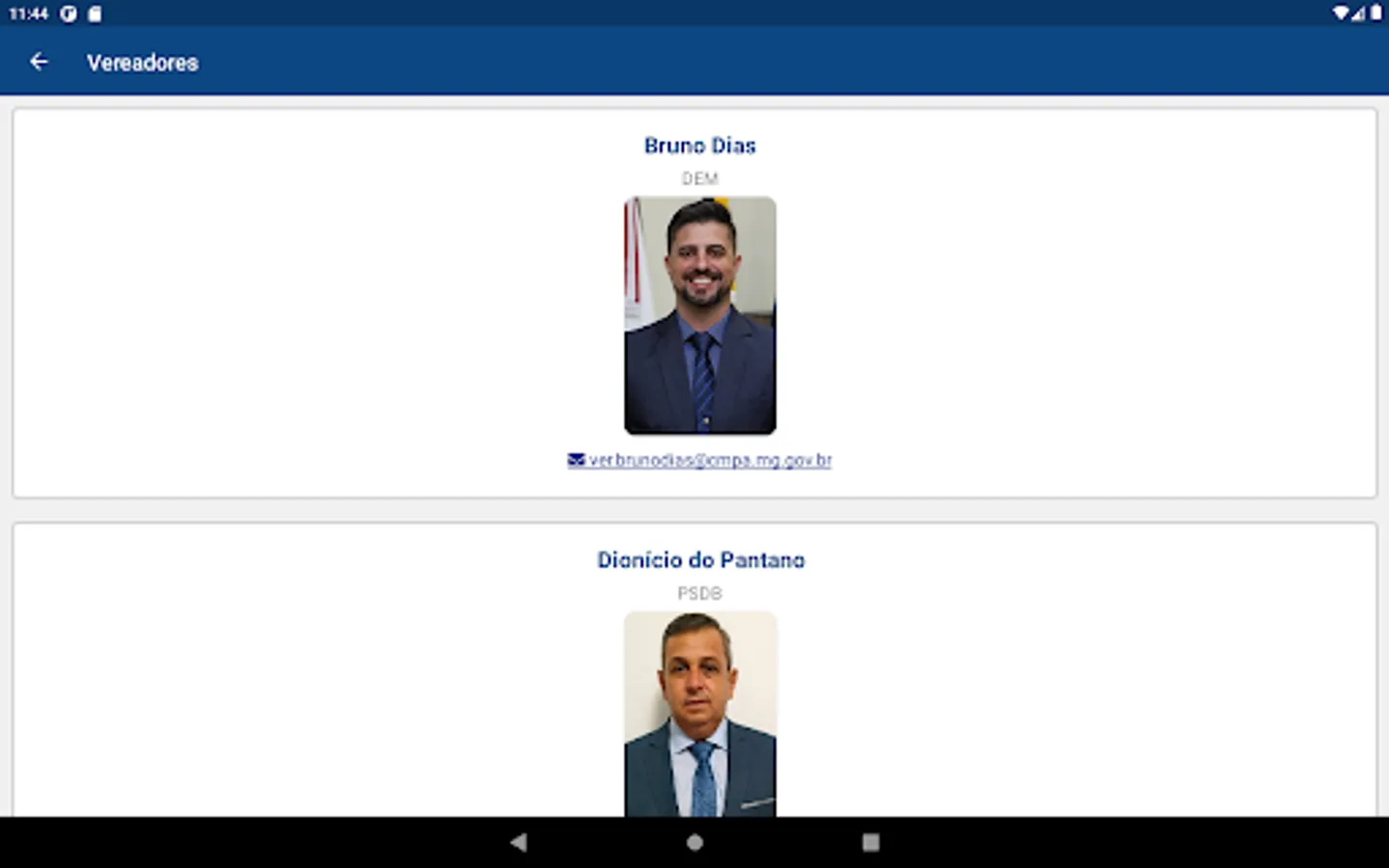 • Consults the list of Councilors in office, showing the name, party, e-mail, telephone, links to proposals presented, attendance at sessions and nominal votes;