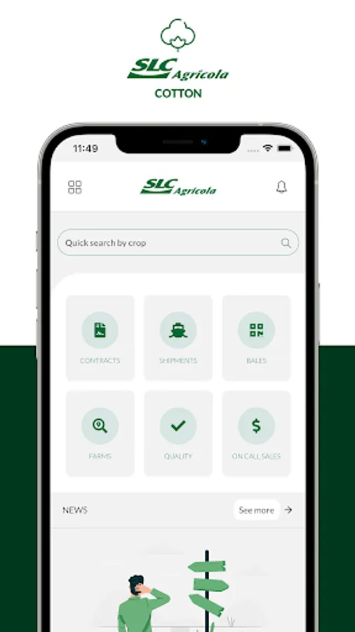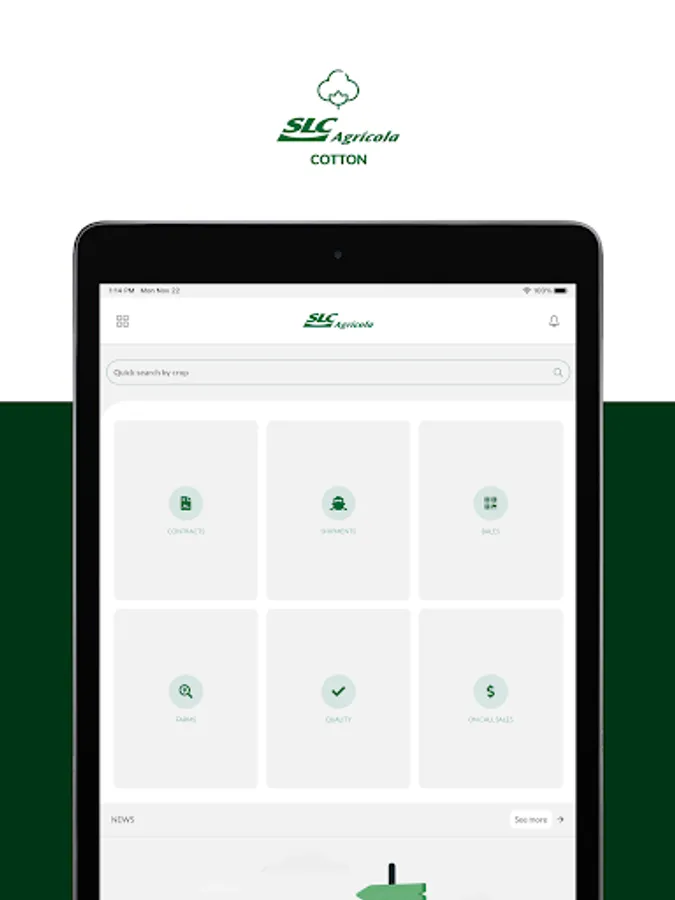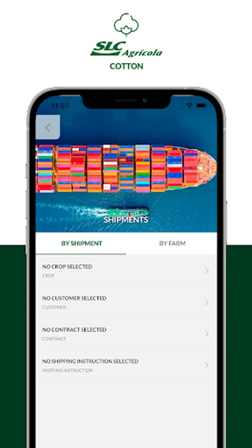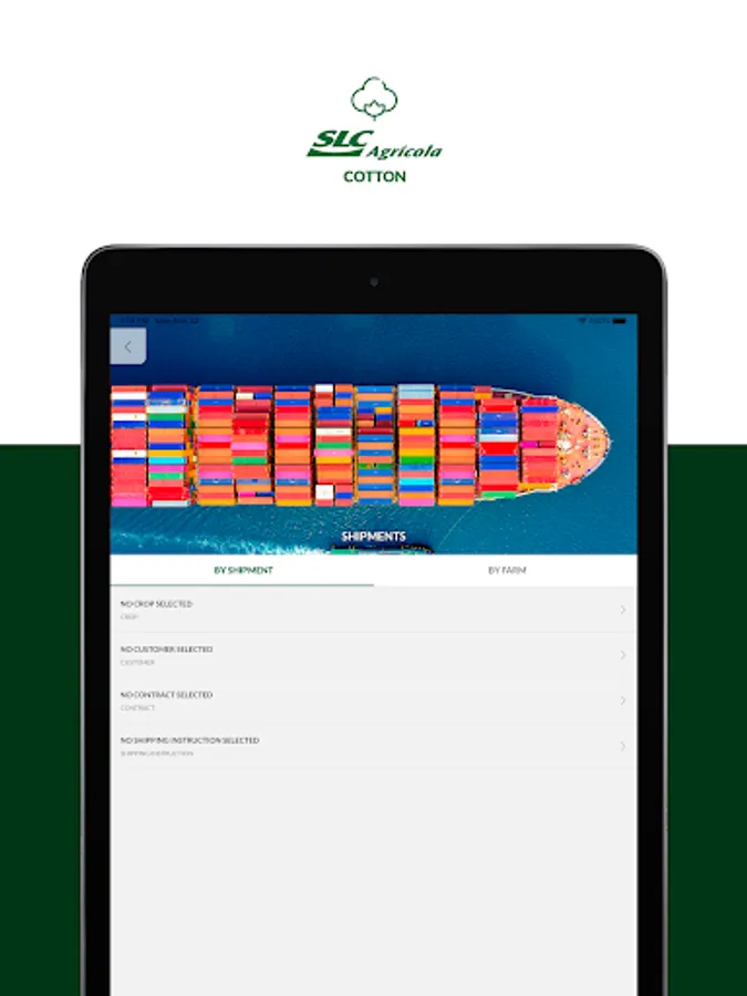 Trough the app SLC Cotton the clients that bought cotton lint from SLC Agrícola will be able to see the quality data of the cotton that has been applied to its contracts, as well as the updates of the status of every shipping instruction.