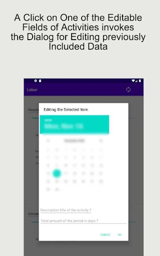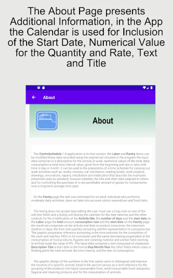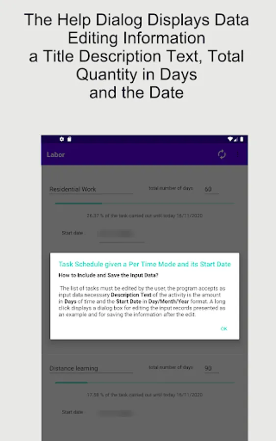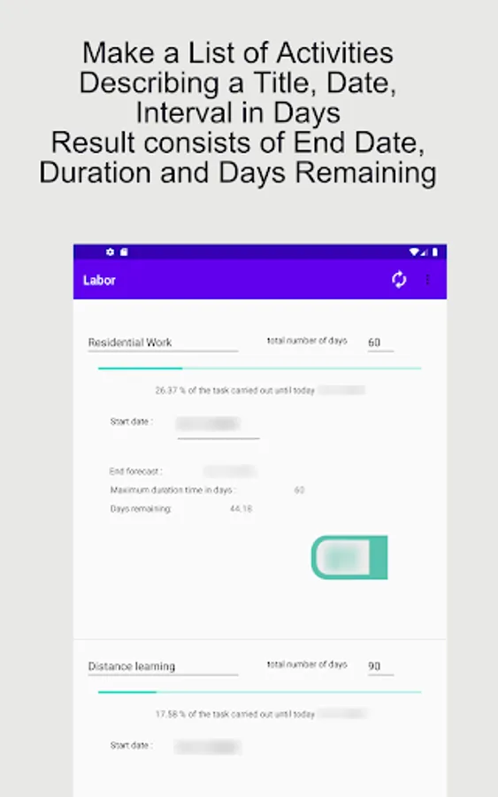 The app displays in a list a set of activities that can be renamed, a range of calendar days, the start date must be informed of the result expressed in a progress bar and a date for the end of the period is calculated, duration time maximum and days remaining.