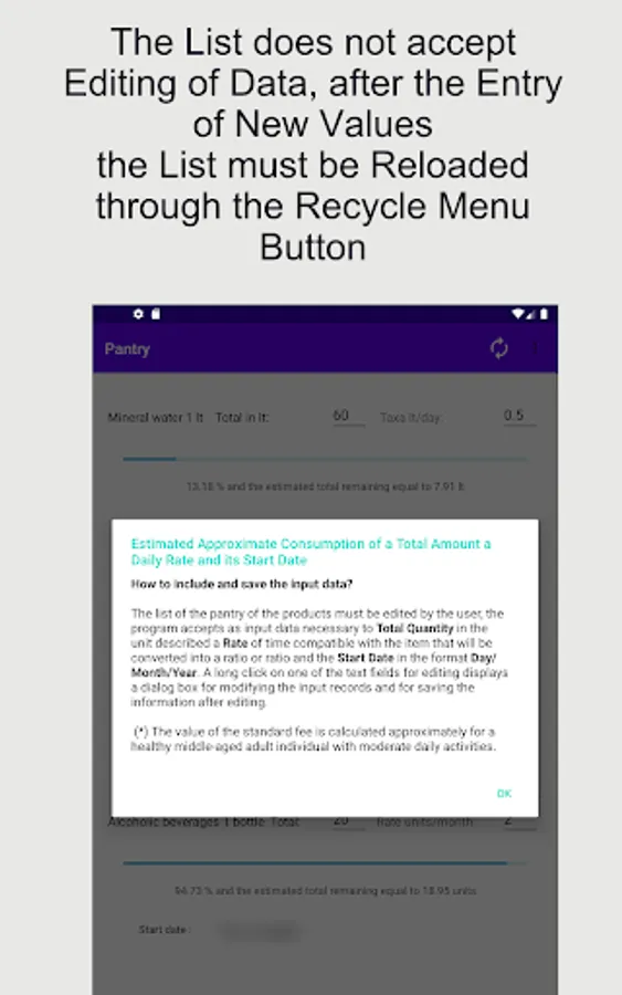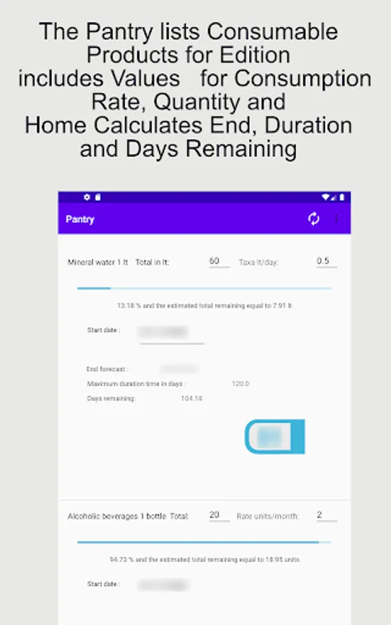 Another option present in consists of a pantry of consumable products that makes it possible to edit the data of the fixed set of items that includes values for the consumption rate, quantity and start date. The end date, the duration time and the Days Remaining. The first option is completed when the progress bar reaches 100% of its completion. The list with the item displays an image that changes from the one originally displayed by default; in the second option, an image with a basket with a negative sign when the total number of items reaches a value less than 5%.