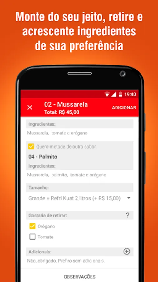 • In product selection you can see ingredients, remove and add ingredients, choose sizes, select two flavors for pizza, and leave a note.