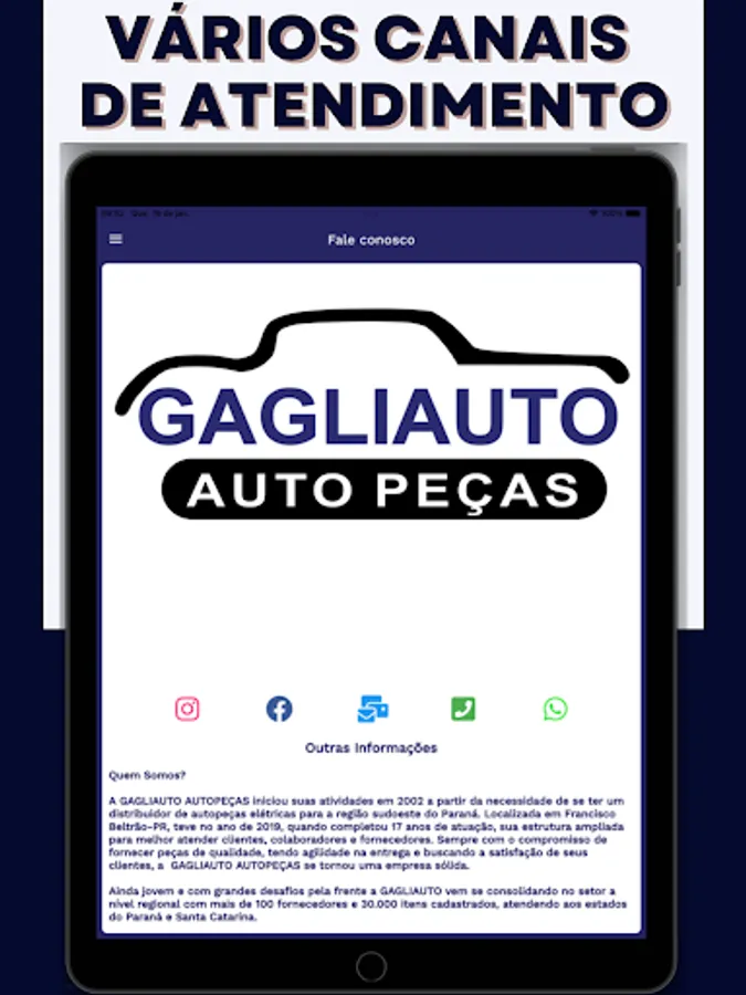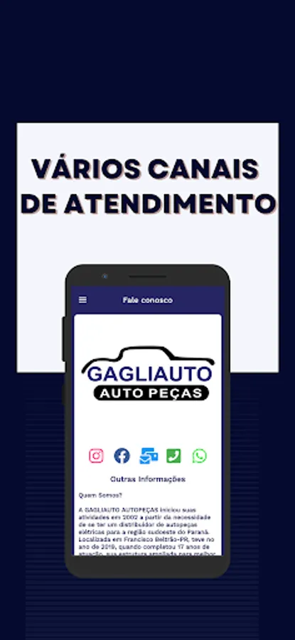 GAGLIAUTO AUTOPEÇAS started its activities in 2002 from the need to have an electric auto parts distributor for the southwest region of Paraná. Located in Francisco Beltrão-PR, in 2019, when it completed 17 years of operation, its structure was expanded to better serve customers, employees and suppliers. Always committed to supplying quality parts, having fast delivery and seeking the satisfaction of its customers, GAGLIAUTO AUTOPEÇAS has become a solid company.