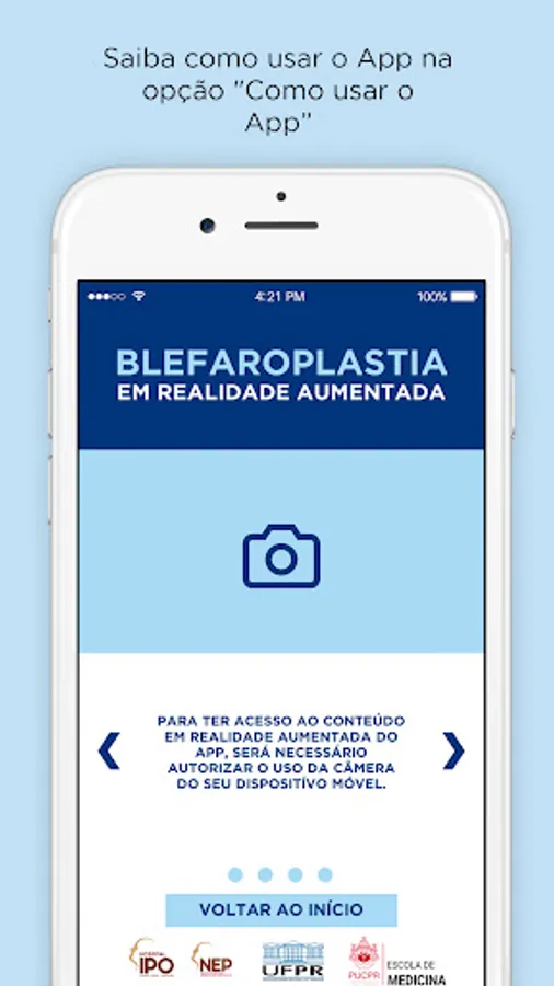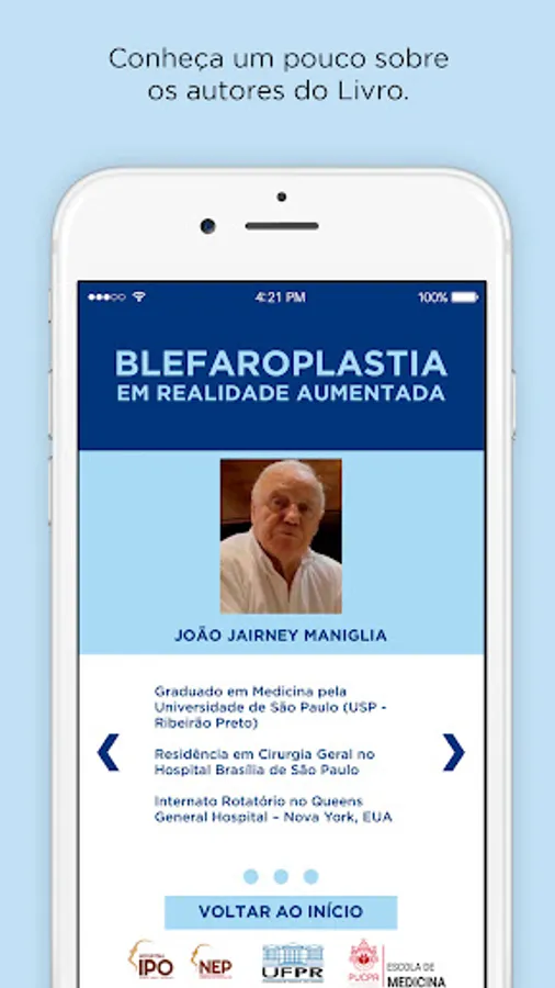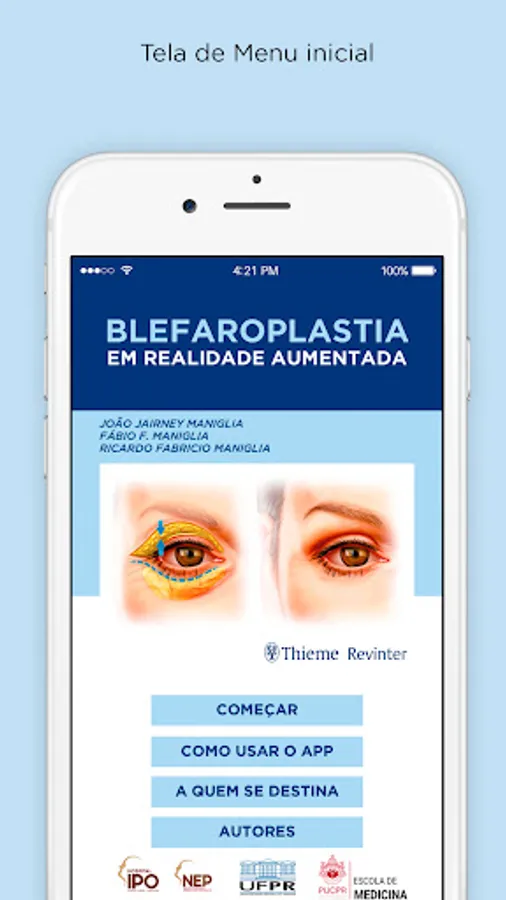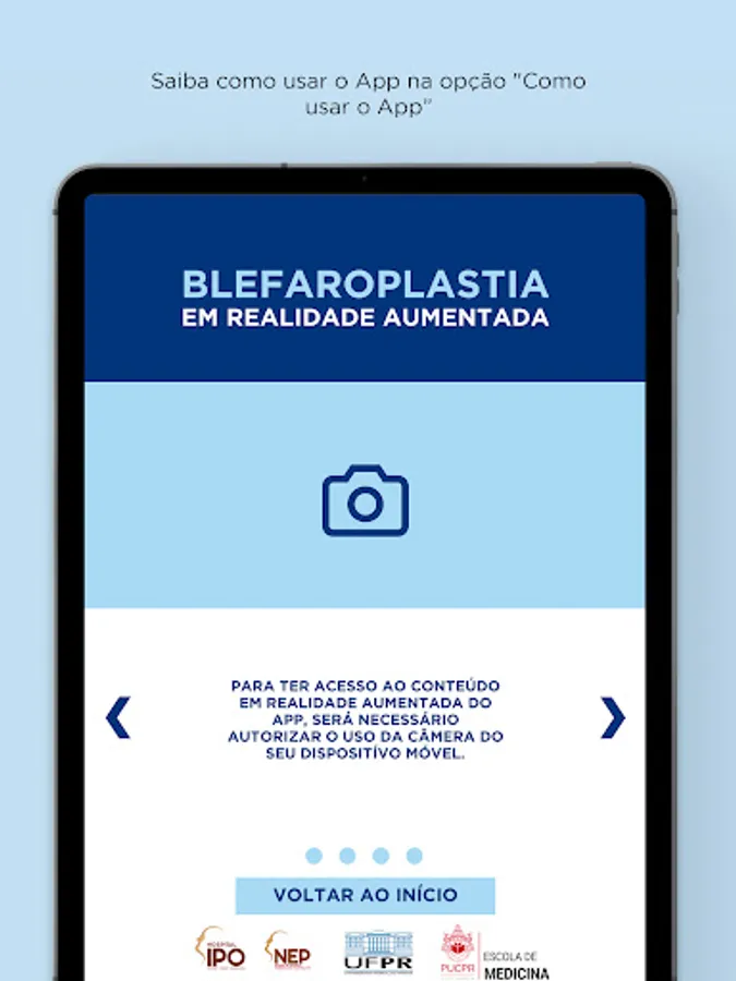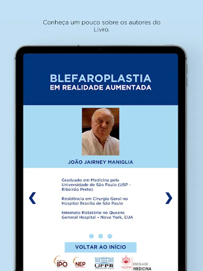 The IPO Blepharoplasty is an application that uses the technology of Augmented Reality to complement the content present in the book IPO Blepharoplasty, written by Doctors João Maniglia, Fábio Maniglia, Ricardo Maniglia and published by IPO-Instituto Paranaense de Otorrinolaringologia. This publication receives digital updates of surgeries captured in high resolution, edited and aided by computer graphics to standardize teaching and add digital value to the printed publication.