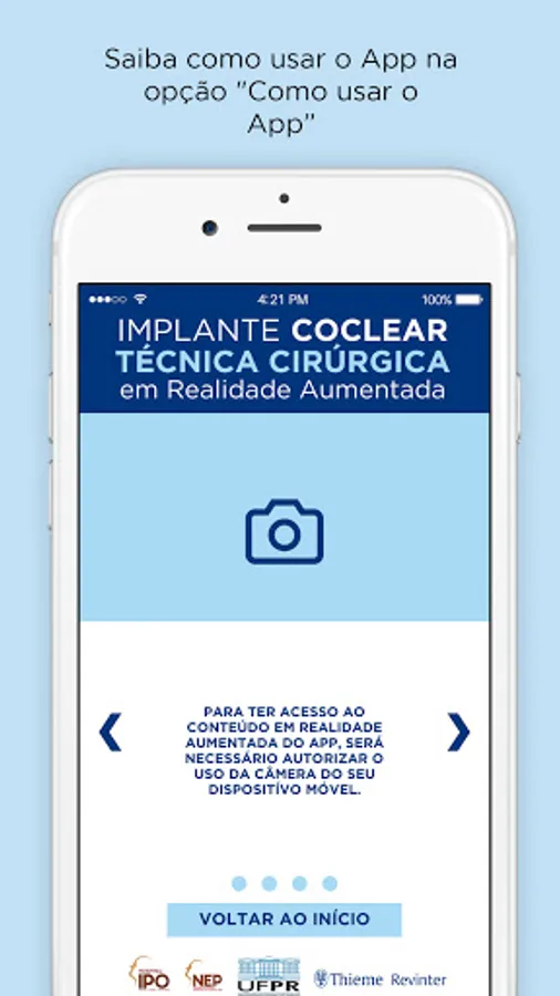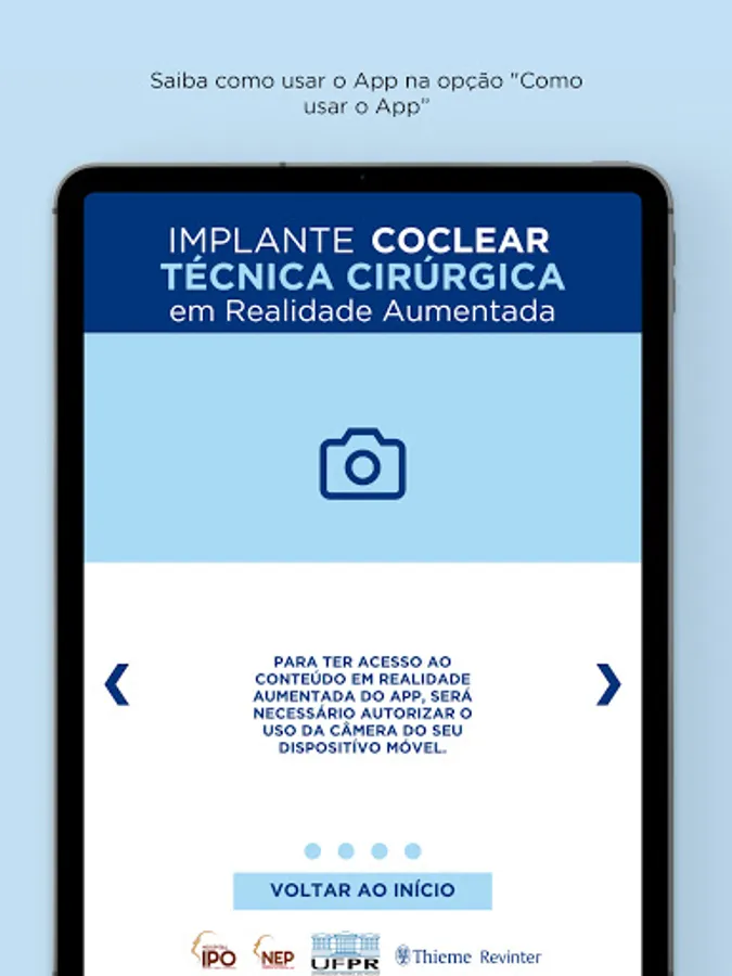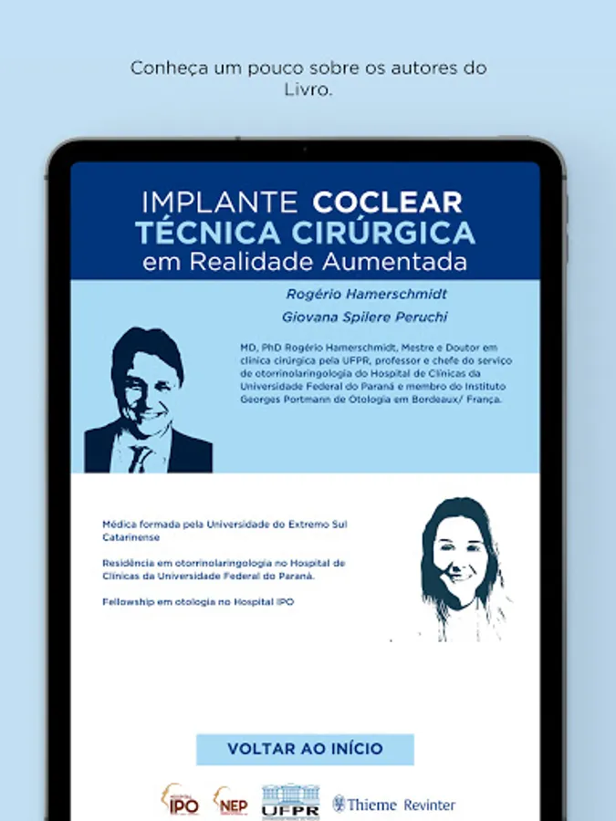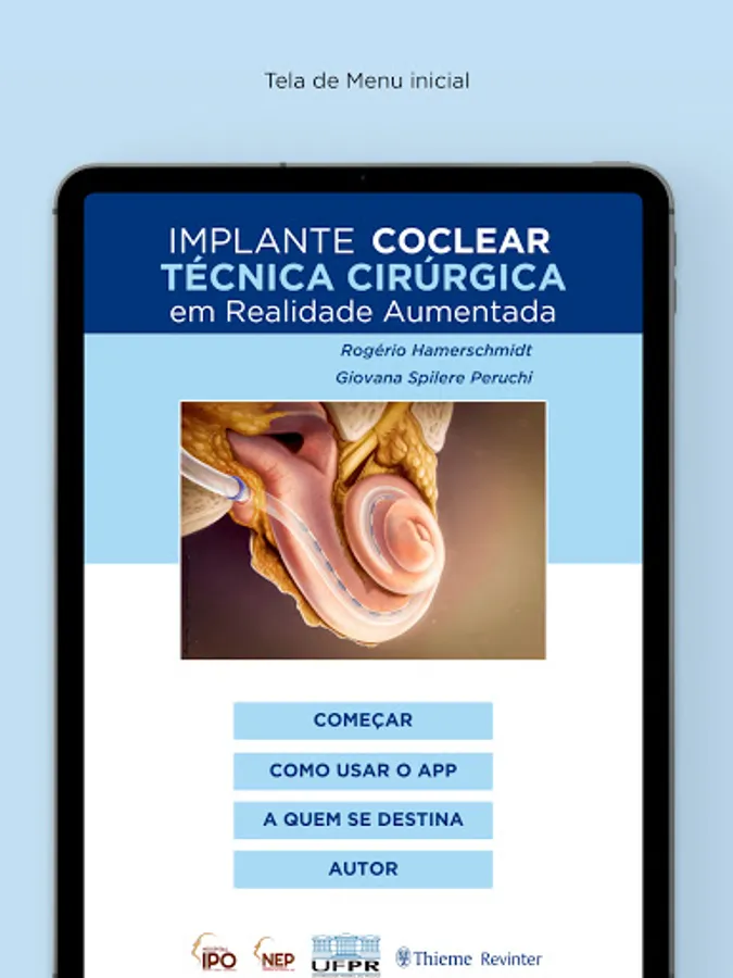 IPO - Cochlear Implant RA is an application that uses Augmented Reality technology to complement the content present in the book "IPO Cochlear Implant" written by Dr. Rogério Hamerschmidt and by Dr. Giovana Spilere Peruchi, and published by IPO-Instituto Paranaense de Otorrinolaringologia in 2020 This publication receives digital updates of surgeries captured in high resolution, edited and aided by computer graphics to standardize teaching and add digital value to the printed publication.