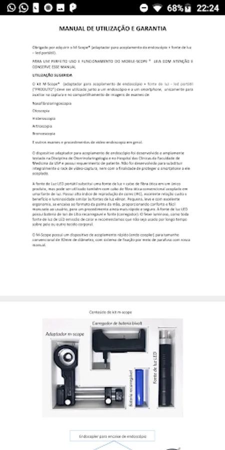 The adapter device for endoscope coupling was developed and extensively tested in the Discipline of Otorhinolaryngology and Hospital das Clínicas of the Faculty of Medicine of USP and has a patent application. It is not designed to fully replace the video-capture rack, nor for the purpose of protecting the attached smartphone. The portable LED light source replaces a light source + fiber optic cable in a single product, but can also be used with conventional fiber optic cable coupled in a light source. It has high color reproduction index (IRC), excellent cost-benefit ratio and brightness similar to xenon light sources. Small, lightweight and with excellent ergonomics, it fits into the shape of the palm, providing comfort and easy handling to the user, for an even faster and safer procedure. The LED light source has a rechargeable Lithium Ion battery and power supply (charger). The light beam as all light source of LED heat emission and we recommend not to be used for long time on skin or other body tissue. The M-Scope has a fast coupling device (endo coopler) for a conventional size of 32mm in diameter, with a screw fastening system with manual thread.