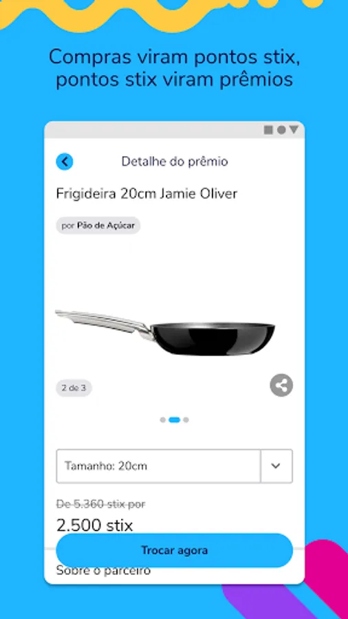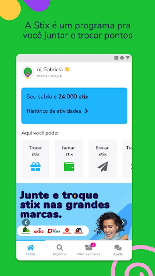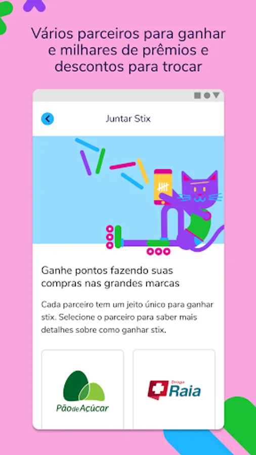 Stix is a loyalty program platform. You shop at the big brands to earn stix points and exchange your stix for prizes or discounts in the Stix app. Earn stix buying at Pão de Açúcar, Extra, Droga Raia, Drogasil, Sodimac and Polishop. And if you have an Itaú credit card, you can transfer your points to use at Stix, all for free.