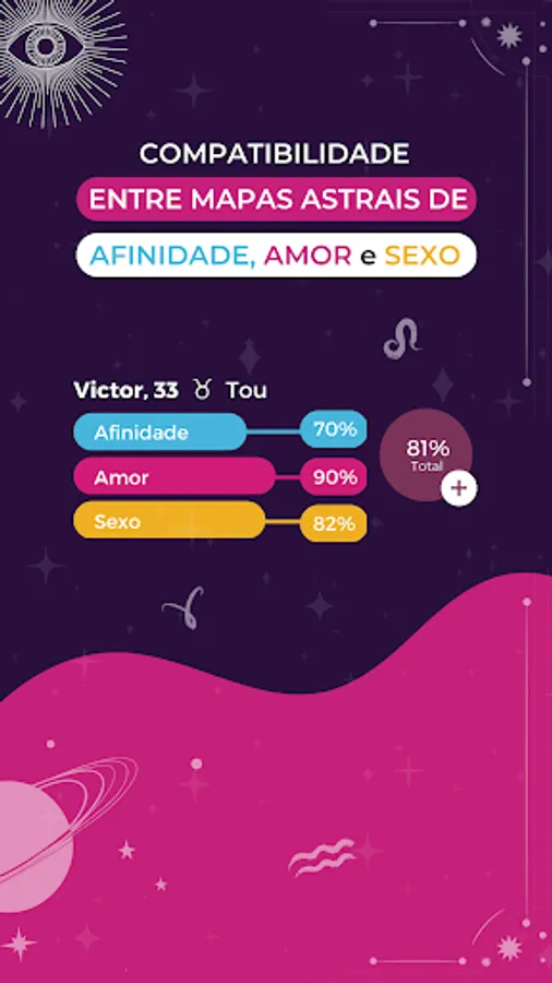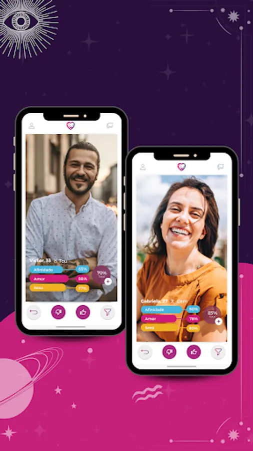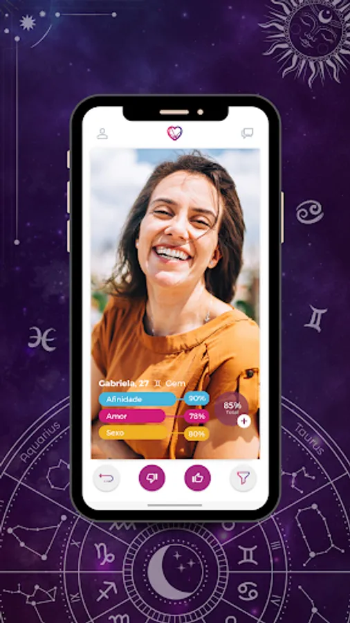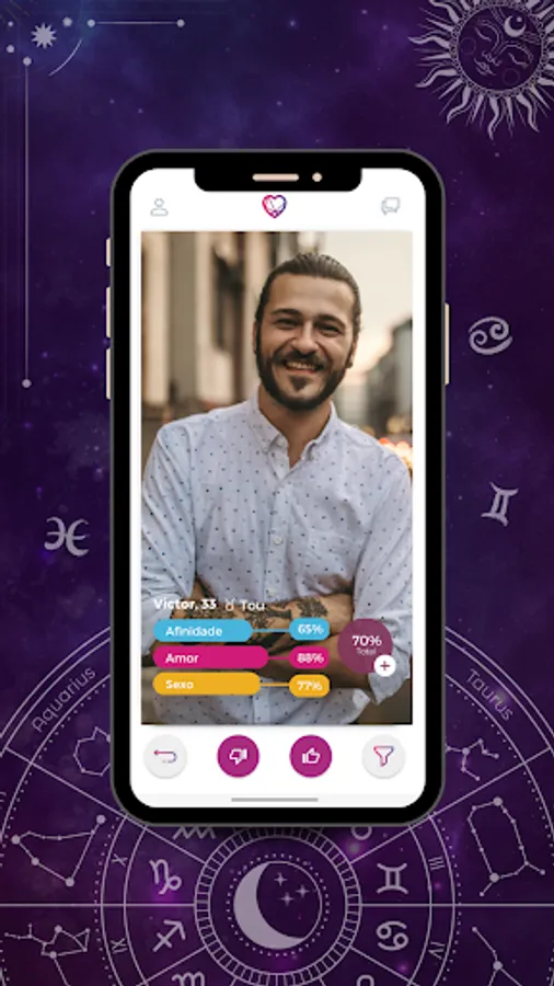 In the app, you choose whether you want to be introduced to men, women or both and start seeing the users' cards. Now comes the best part... I show you your % affinity, love and sex compatibility with people! Perfect huh? Before giving the match, you see if the stars conspire in favor of the relationship.