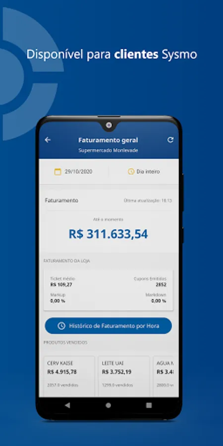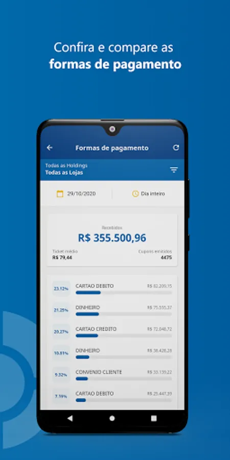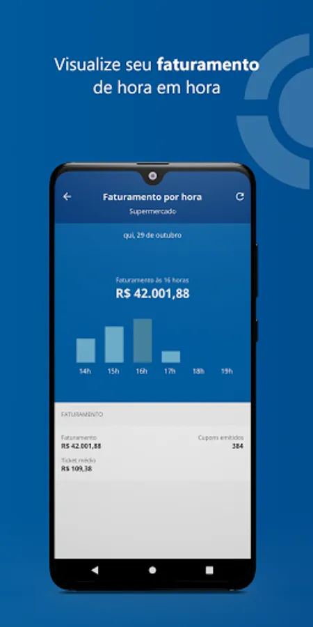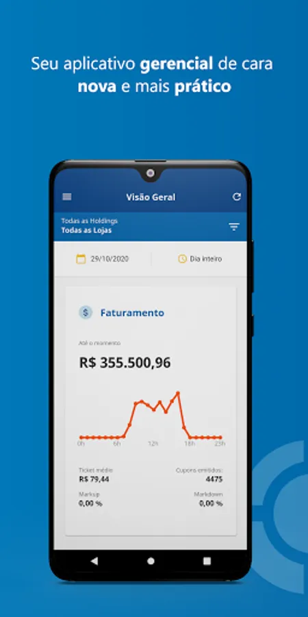 - Billing overview with information on value sold, returns, average ticket and number of coupons issued.