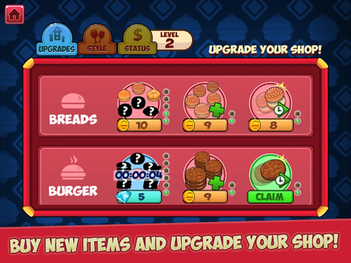 Serve your customers with an efficient service to earn coins that you can use to buy new ingredients and other items to customize your shop. Paint the walls, change the floor, buy new trays, lights and much more. You can also unlock new ingredients to make even more burgers and let your business grow.