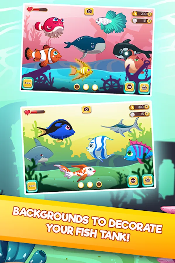 • Change the background of your aquarium: choose among old and rare ruins, mysterious shipwrecks, a calm blue ocean, or unique green and pink oceans!