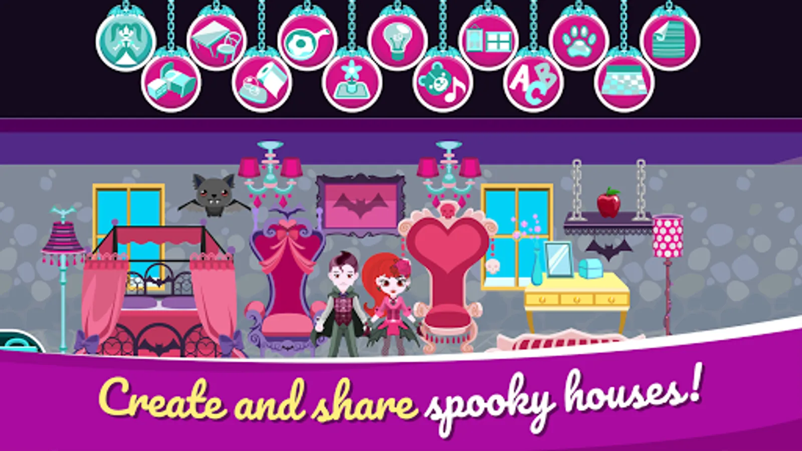 Your nest doesn’t have to be all sugar and rainbows to be a cozy doll house in this spooky doll games and decorate house experience! Why not decorate an unconventional setting full of eccentric and frrrrrrrrrrightening dress up games characters? Use your creativity to design incredibly hair-raising bedrooms, living rooms, bathrooms, kitchens and much more!