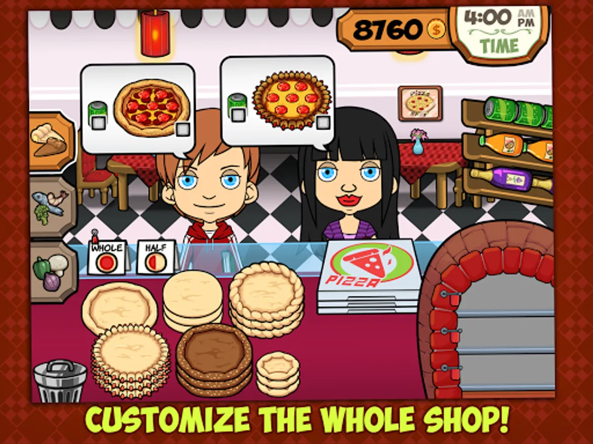 Earn coins with every sale and buy new ingredients, drinks and even new items to customize your pizza shop and make it even better, just the way you want! Paint the walls, change the floor, buy new trays and pizza boxes, lights and much more!