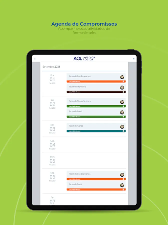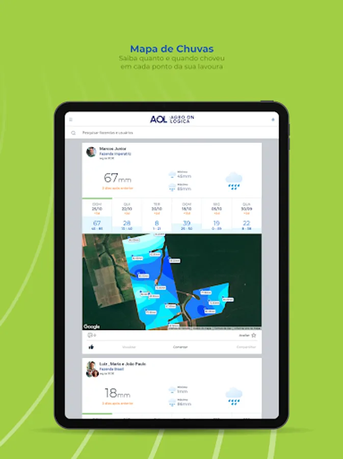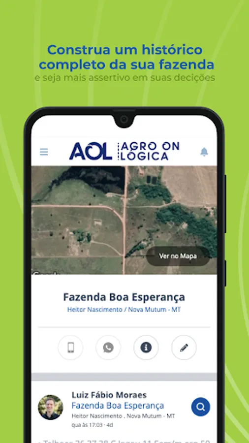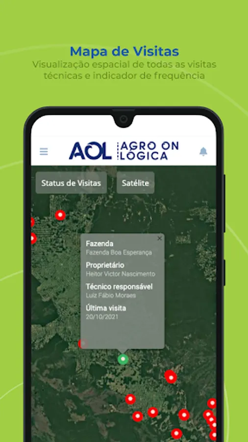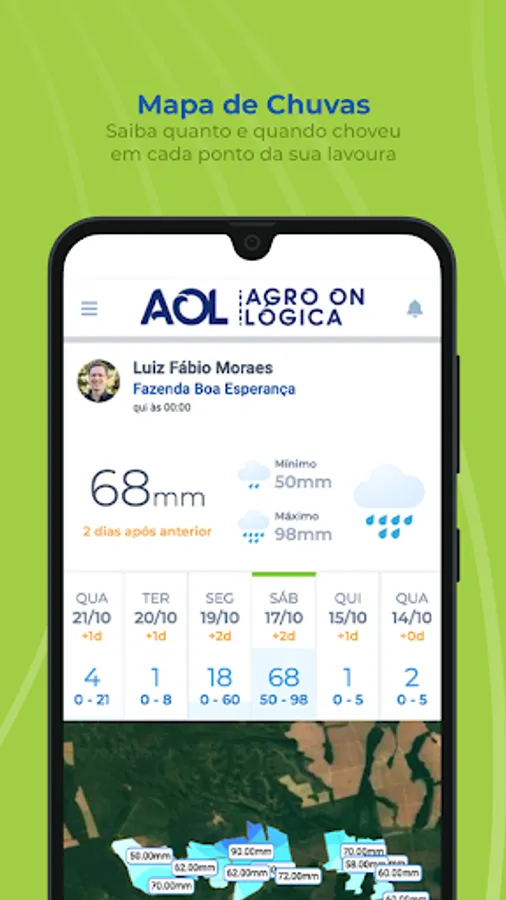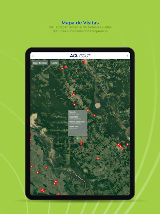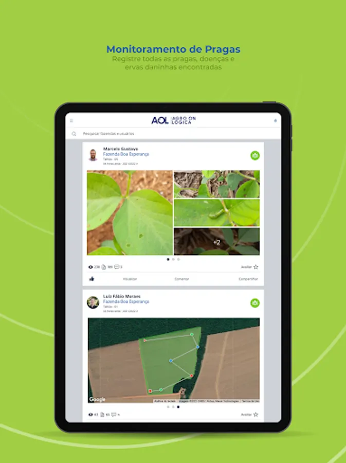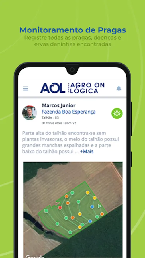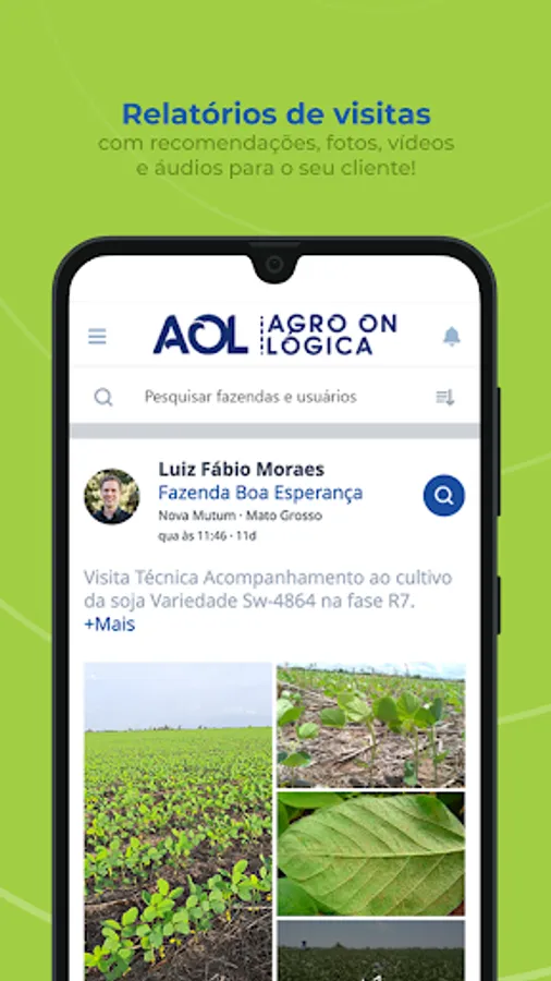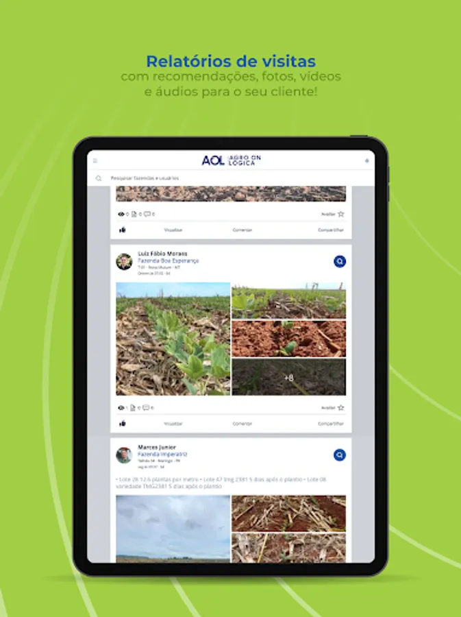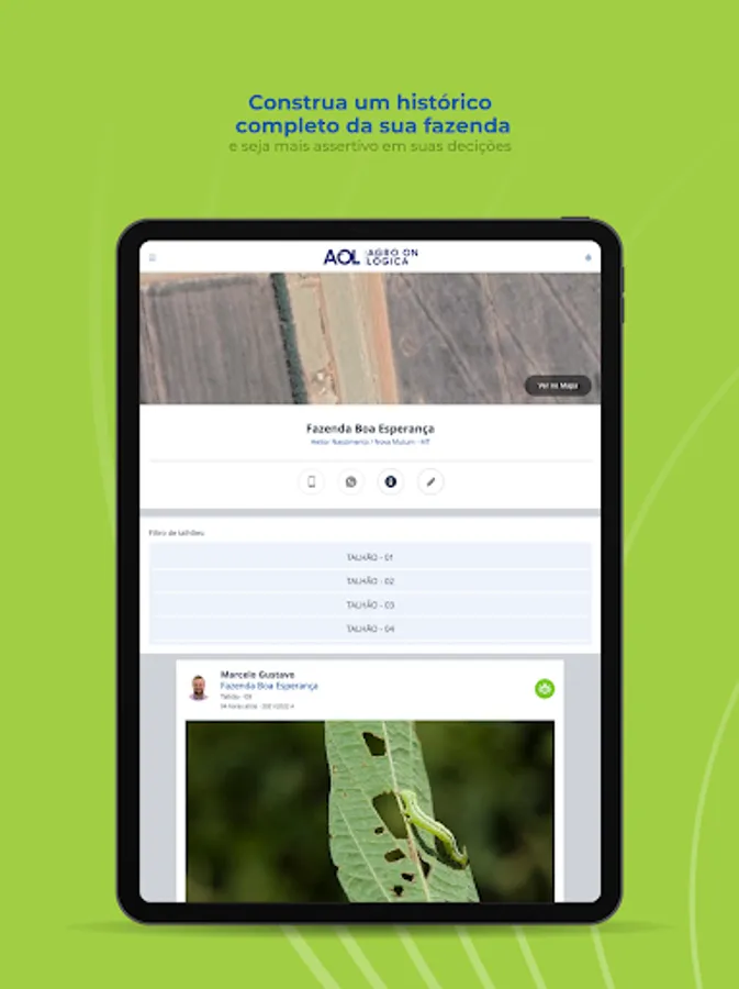 AOL is Agrológica's digital platform composed of several technology tools that aim to assist the producer/customer in managing their property and contribute with real-time information. The tool facilitates day-to-day decision making and provides the user with a history composed of reports generated by field consultants, with photos and explanations of the procedures and applications that took place on the property throughout the harvest.