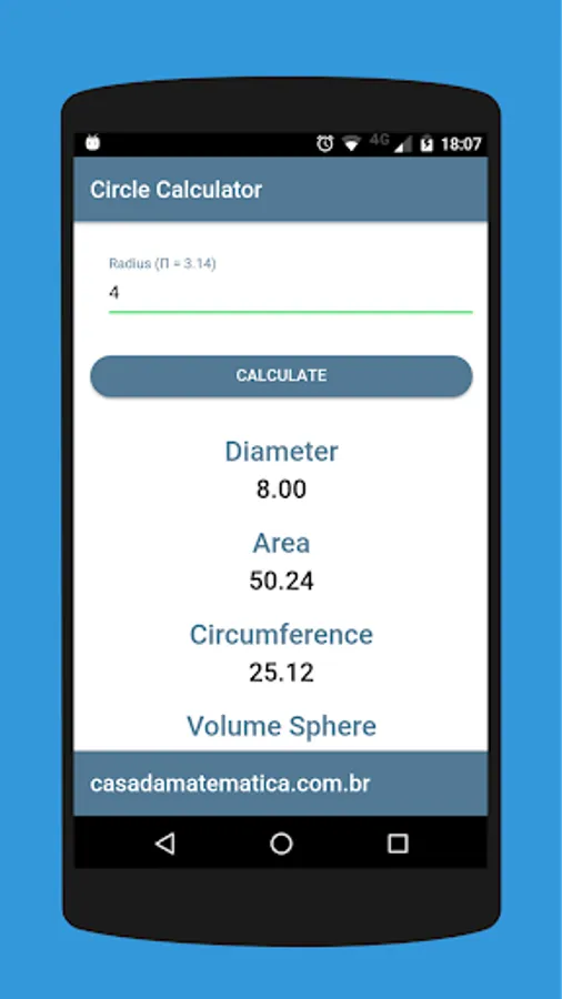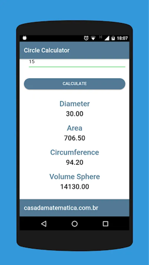 Calculate the main geometric measures of a circle: diameter, area, circumference