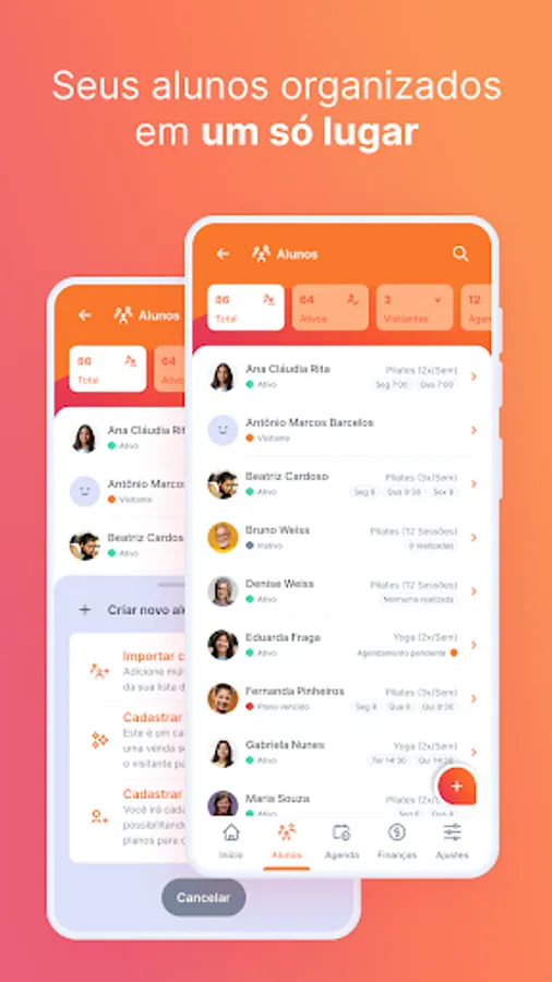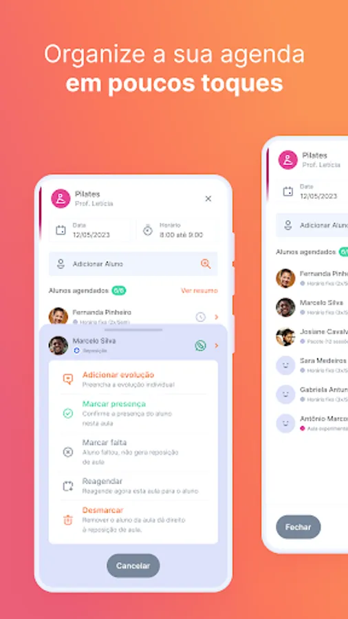 • Include all your students in the app, to speed things up you can include them by importing contacts from your cell phone. Then just identify his plan and make appointments. There's no mistake, just follow the step by step.